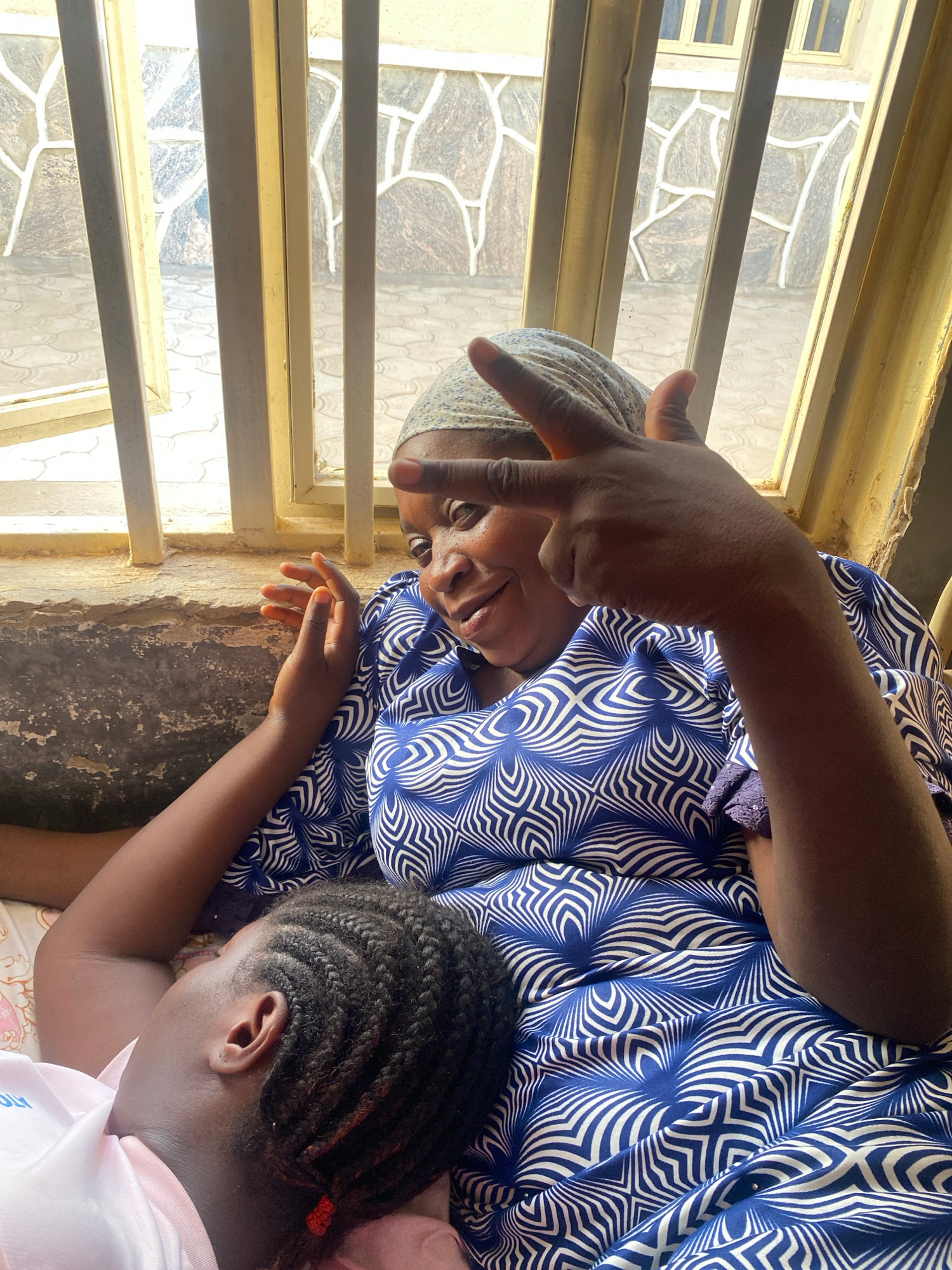 A medium shot shows a woman and a young person inside a building in Rido, Nigeria. The woman, wearing a blue and white patterned shirt and a headwrap, faces the camera and holds up two fingers in a "p…read more