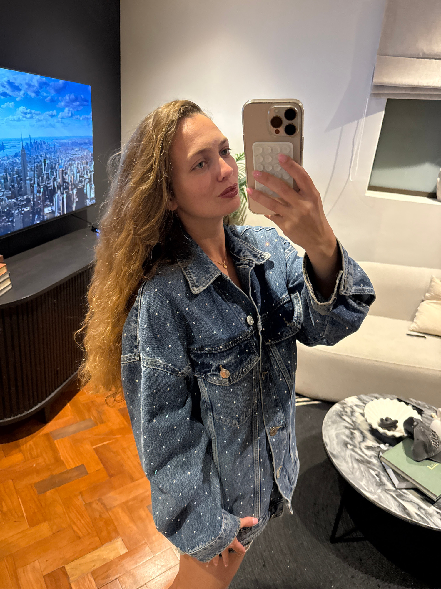 A woman is taking a selfie in an indoor setting. She is holding a smartphone in her right hand, and the camera is pointed at her face. She has long, blonde hair and is wearing a blue denim jacket with…read more