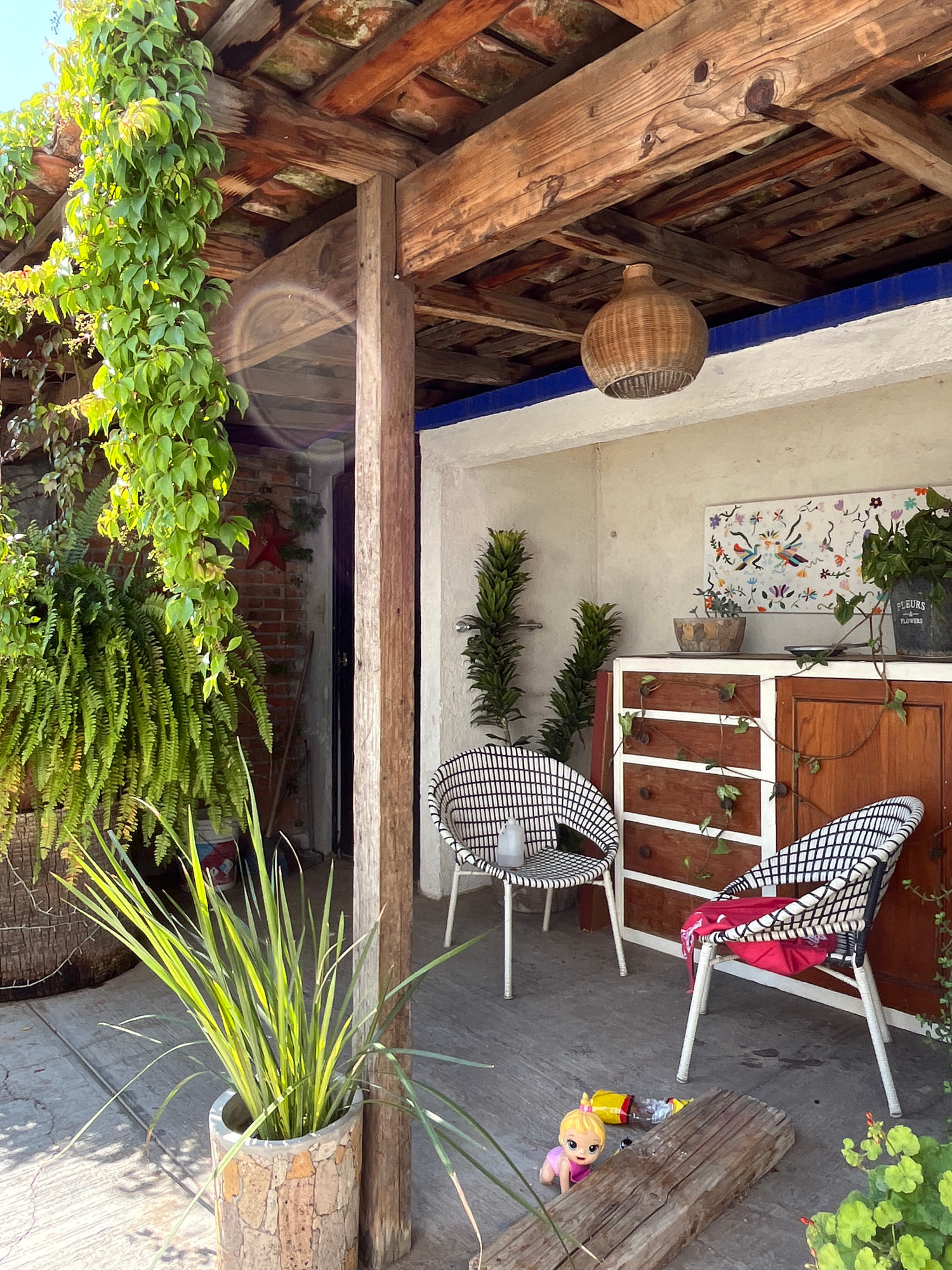 The image is an outdoor scene, possibly a patio or courtyard, in the city of Puebla, Mexico. The image contains two black and white patterned chairs, a wooden cabinet, and various plants. The architec…read more