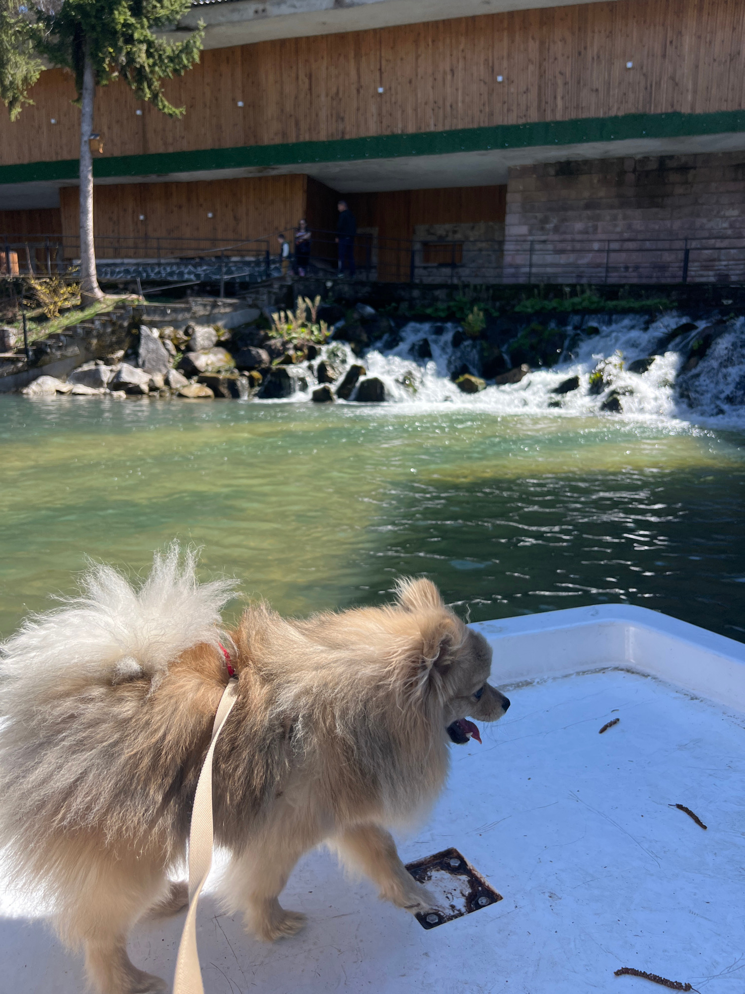 A medium shot from above depicts a tan-and-white dog on a white surface, with a leash attached. The dog is looking towards a waterfall. The waterfall is part of a stream, with visible rocks along the…read more