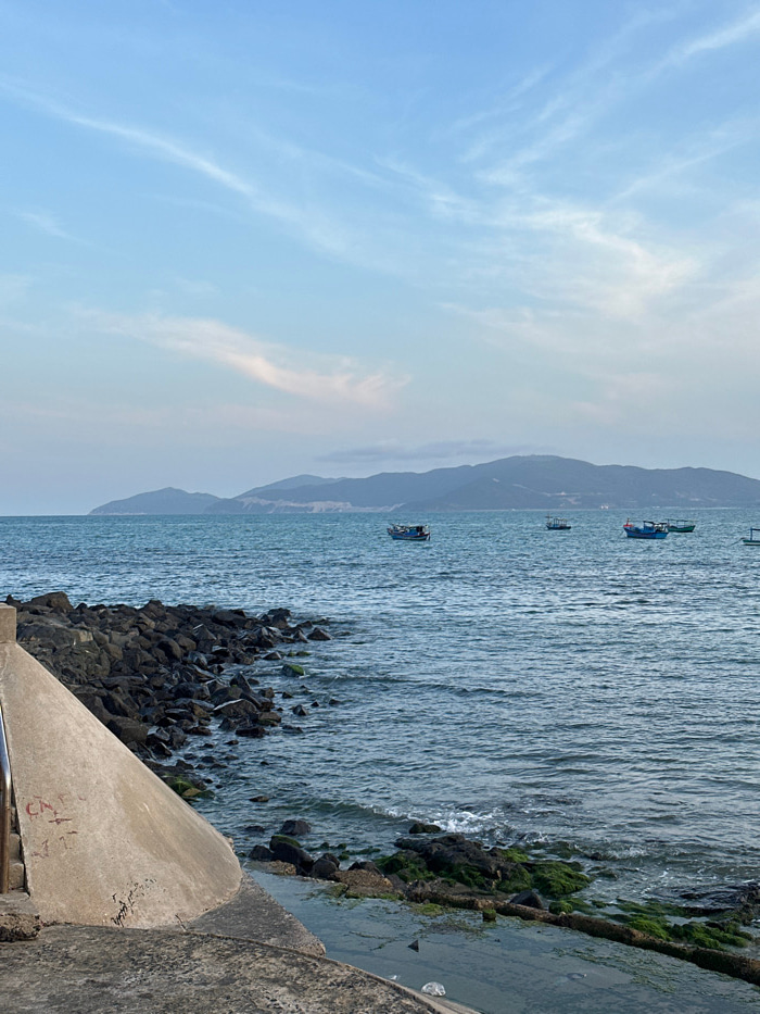 The image depicts a coastal scene in Nha Trang, Vietnam, under a pale blue sky with wispy white clouds. In the foreground, a light-grey concrete sea wall or pier section, exhibiting minor graffiti in…read more