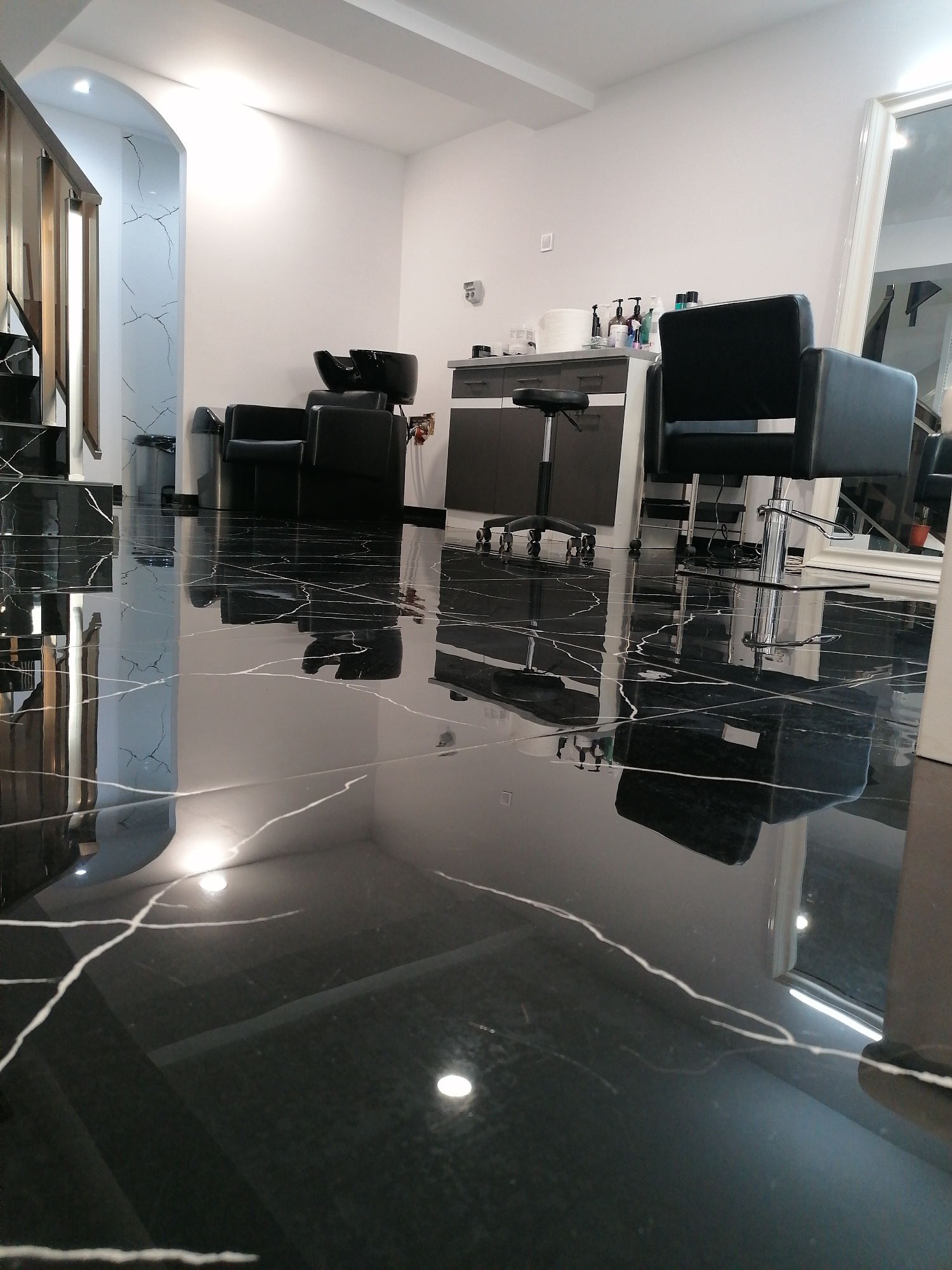 The image depicts the interior of a hair salon, likely located in Kazanlak, Bulgaria, based on the image source's location. The scene is characterized by a modern aesthetic with a black and white colo…read more