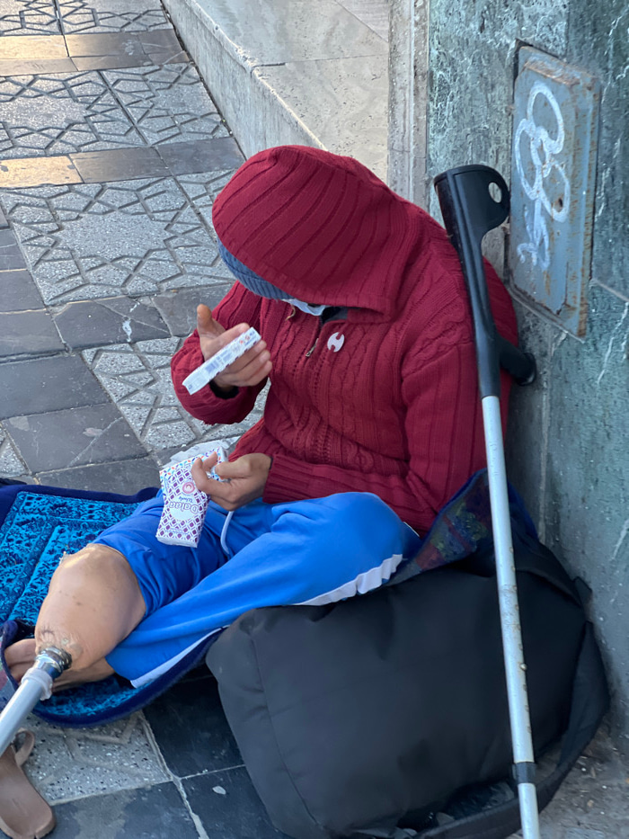An individual with a prosthetic left leg is seated on a blue patterned mat on a geometrically tiled pavement in Tanger, Morocco. The person is dressed in a deep red hooded sweater, a grey-blue beanie…read more