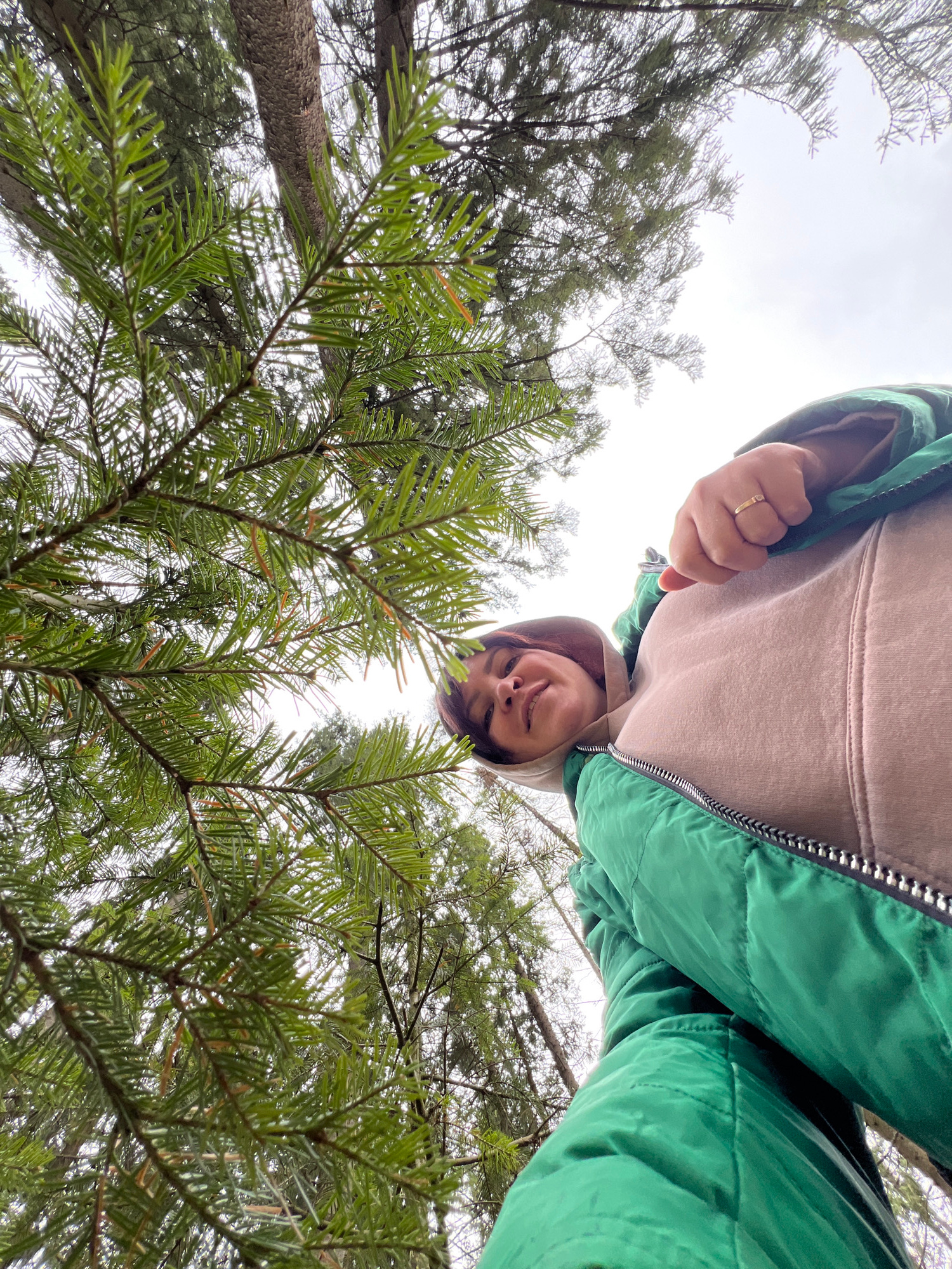 A low-angle, selfie-style photograph shows a person standing upside down in a forest or wooded area. The person is wearing a beige hooded sweatshirt under a green puffy jacket with a silver zipper. A…read more