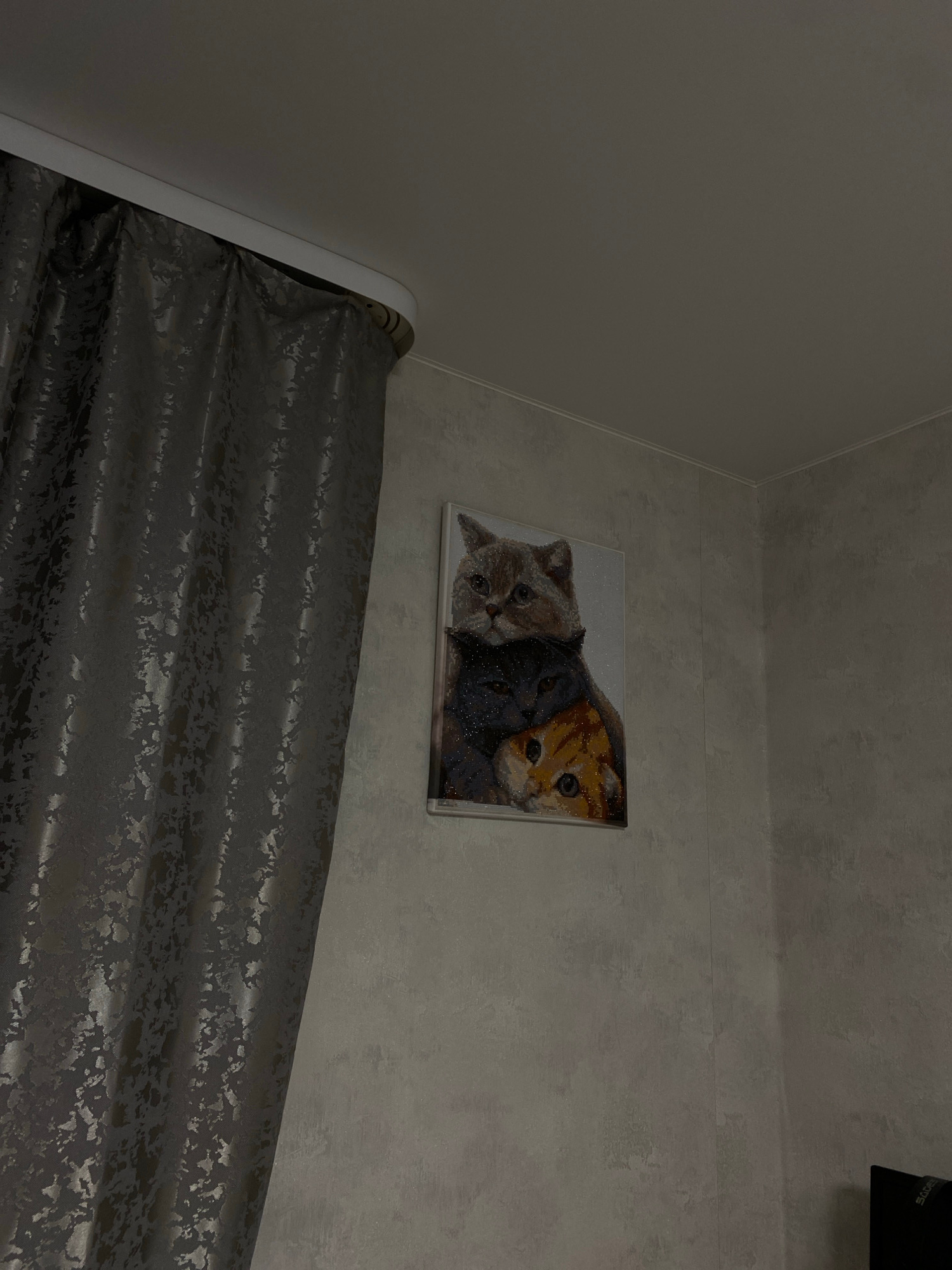 The image displays an indoor scene, likely a room in Chaikovsky, Russia, captured from a low angle looking upwards. The walls are light grey or beige with a subtle textured pattern. A corner where two…read more