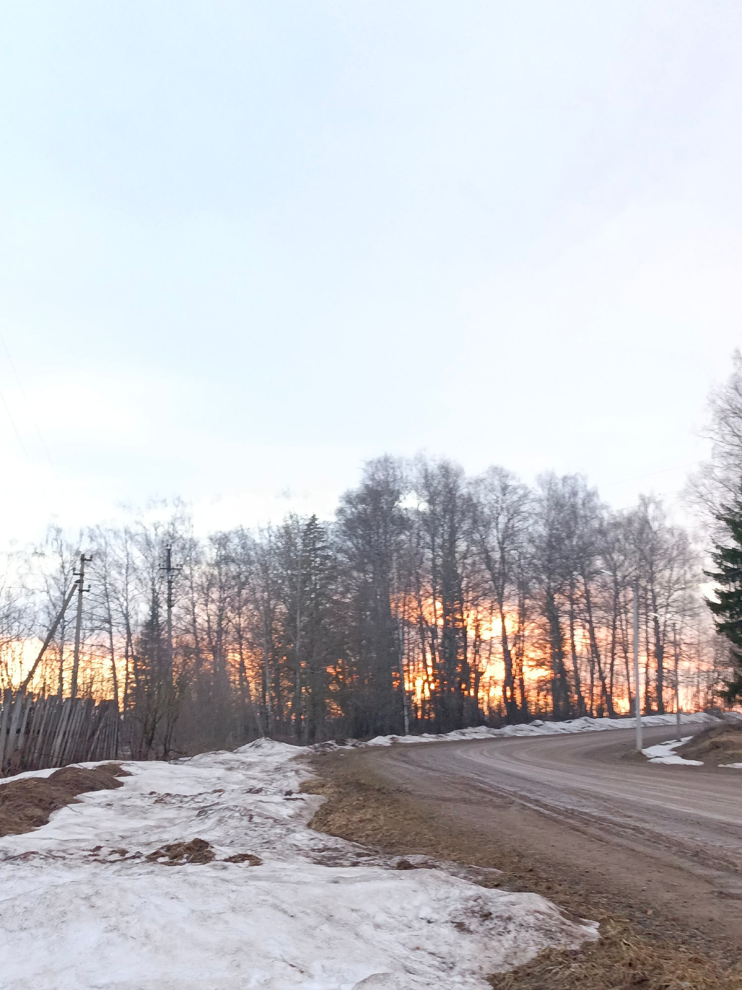 The image depicts a dirt road curving through a landscape with melting snow. Trees line the edge of the road, with the setting sun casting an orange glow through the branches. A wooden fence stands to…read more