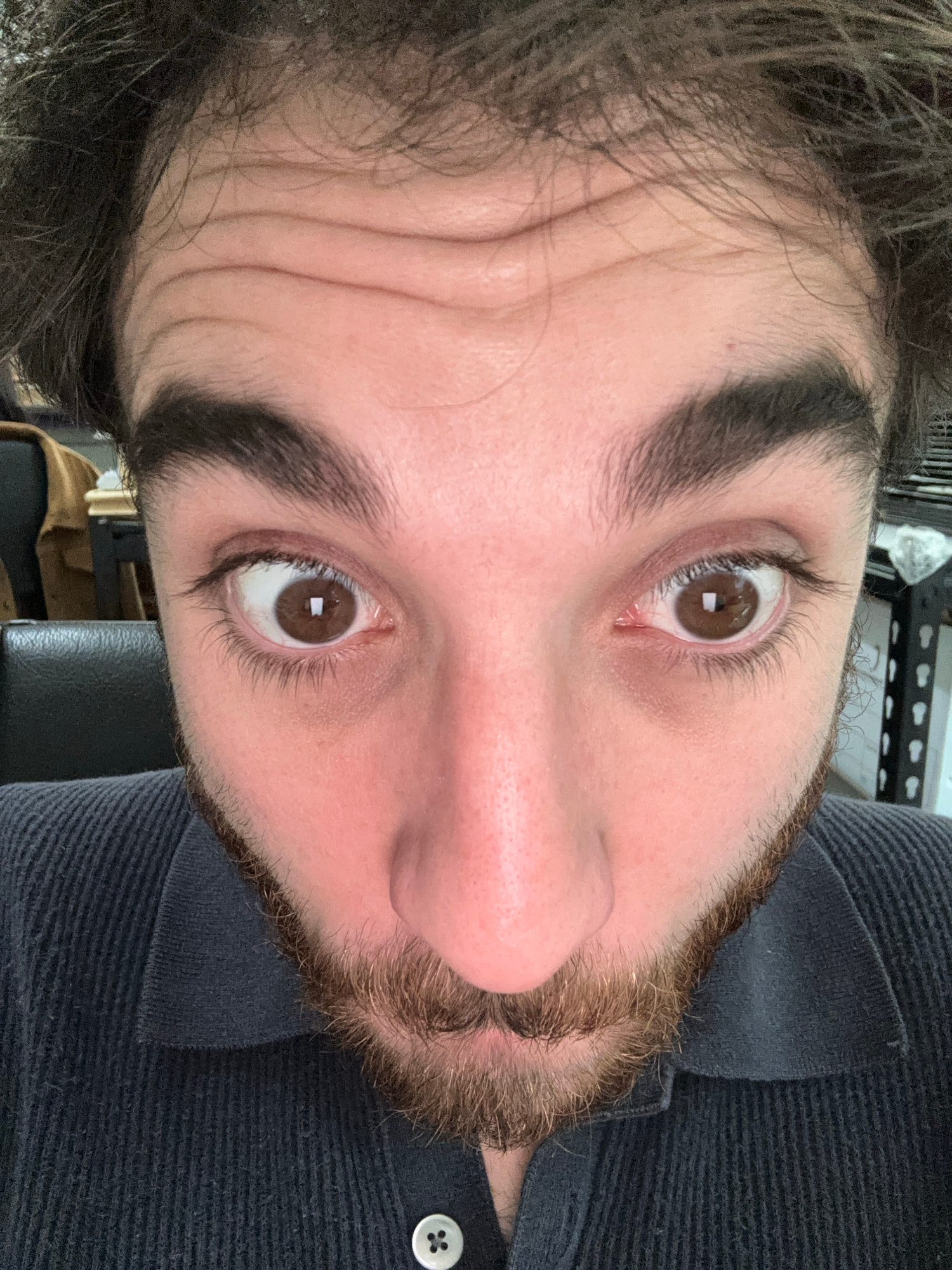 A close-up, tilted photograph of a Caucasian male’s face. The subject has brown hair, brown eyes, and a brown beard. Wrinkles are visible on his forehead. He is wearing a dark-colored, buttoned shirt.…read more