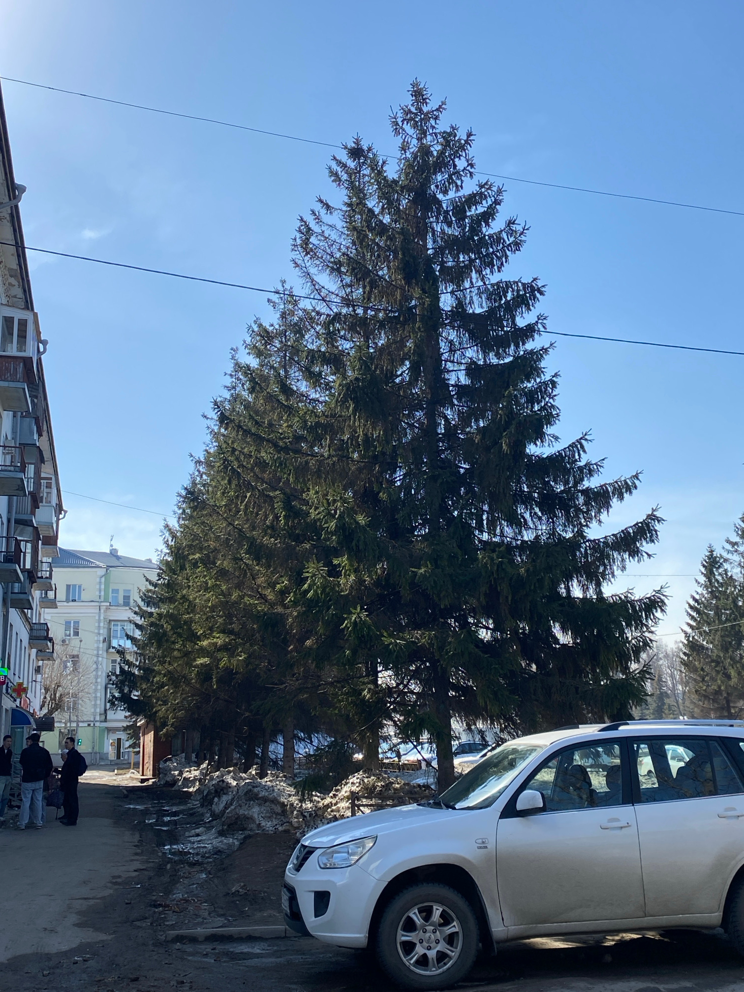 The image shows a street scene in Kazan, Russia. A tall evergreen tree dominates the left side of the frame, partially obscuring buildings in the background. To the right, a white SUV is parked on the…read more