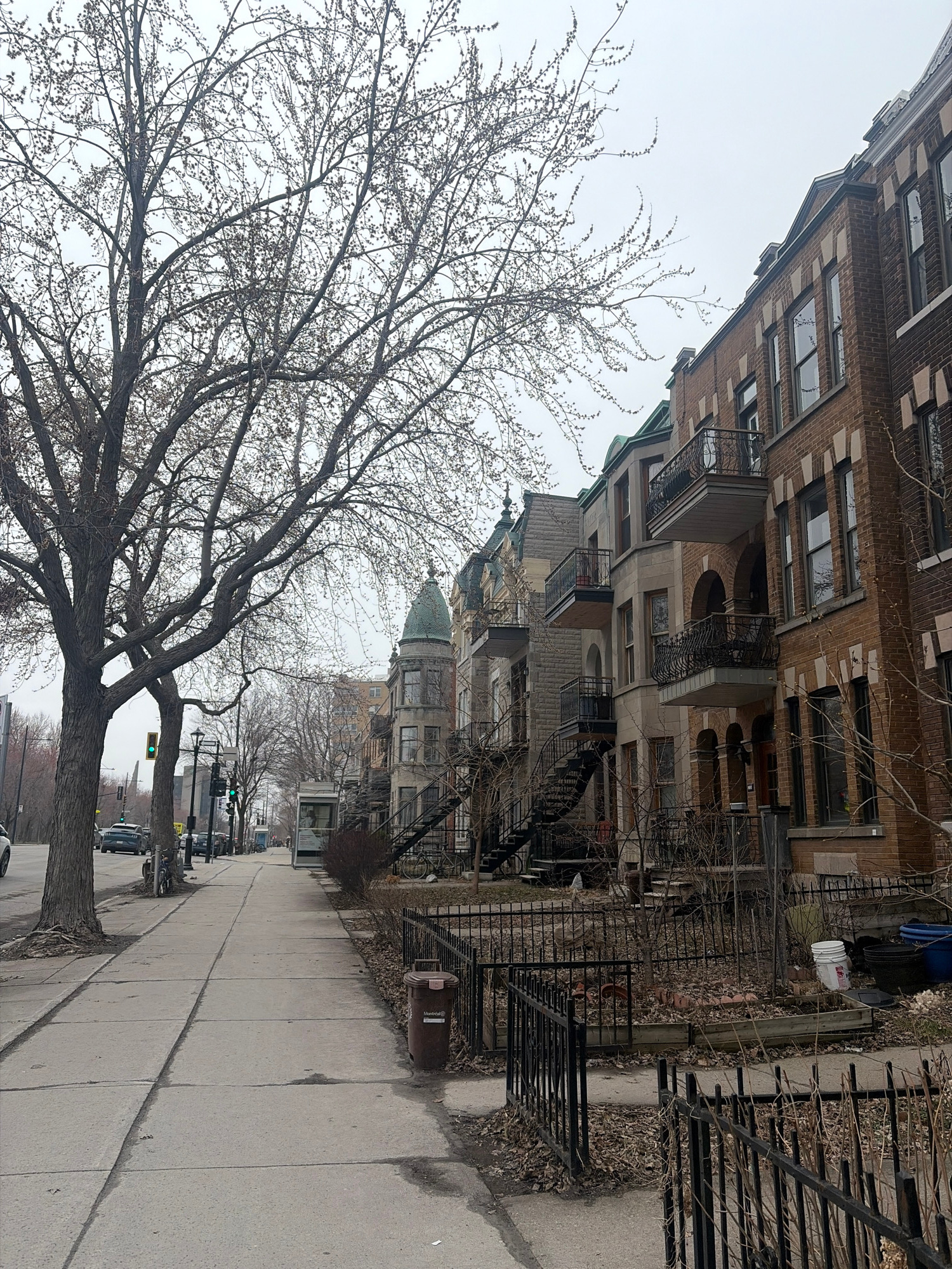 This media file captures a wide-angle street scene in what appears to be Montreal, Canada, under an overcast sky. The image is oriented with the street running from the bottom left towards the upper r…read more