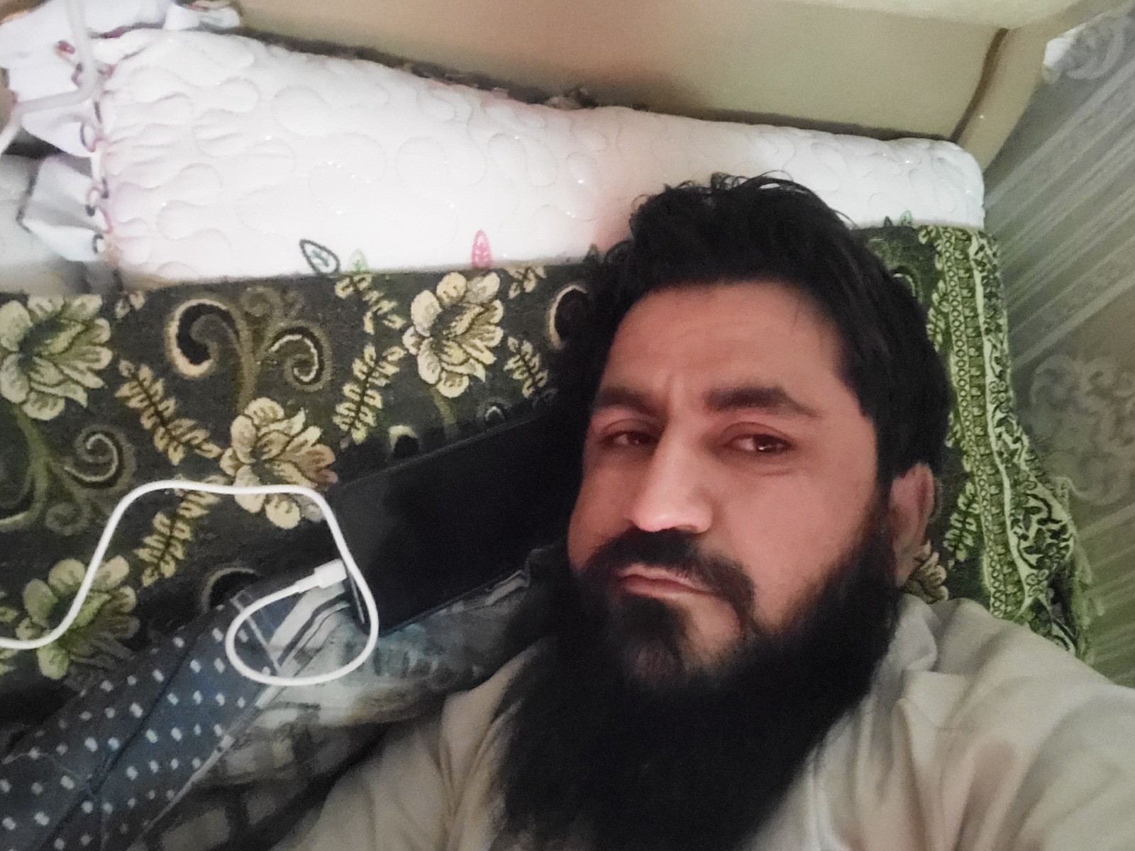 A man with dark hair and a full beard is lying down, taking a selfie. He is positioned against a patterned cushion, with a white, quilted bolster behind him. A white charging cable is visible near the…read more