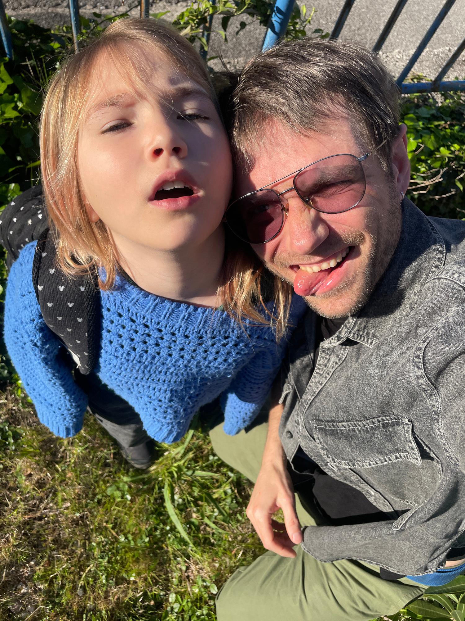 A man and a child are reclining on a grassy area, possibly in Podličak, Montenegro. The man, wearing sunglasses, a grey denim jacket, and olive green pants, sticks his tongue out in jest. A child with…read more