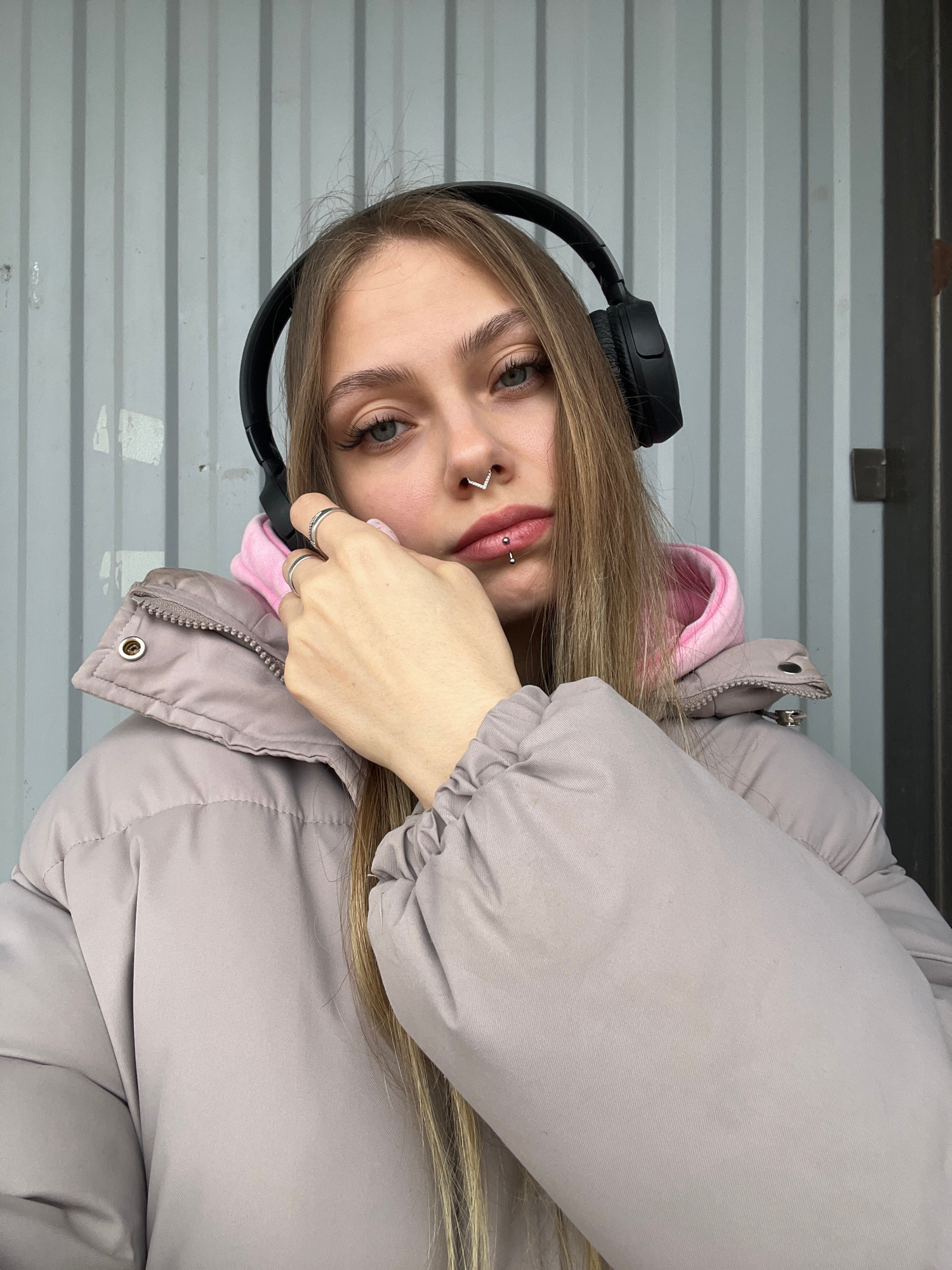 A young woman poses for a photo against a corrugated metal wall. She is wearing headphones, a pink hoodie, and a beige puffer jacket. She has facial piercings on her nose and lip. The location is in Ф…read more