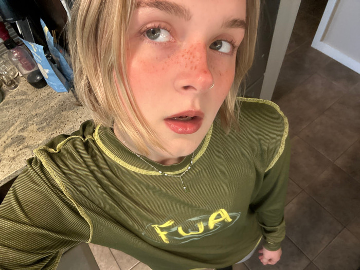 A fair-skinned individual with blonde hair, light-colored eyes, and visible freckles across the nose and cheeks is photographed in an indoor setting in Whistler, Canada. The individual wears a small s…read more