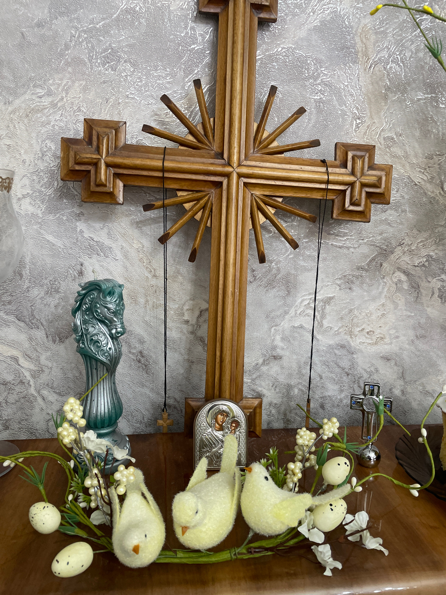 The image shows a close-up, slightly angled, overhead shot of religious and decorative objects. A large wooden cross with a sunburst design is prominently featured against a textured gray and white background that appears to be wallpaper. Two thin black strings are attached to the cross. To the right of the cross is a dark brown wooden surface, likely a shelf or cabinet. On this surface, there are several objects including: 1. A silver cross with blue accents. 2. Three small, fluffy, yellow birds positioned vertically among artificial foliage with small white flowers and speckled eggs. 3. A silver-colored ornate container or vessel with a green tint. The presence of the religious objects, crosses, and decorated birds and eggs suggests the scene might be set in a religious or festive context, such as an Orthodox Christian Easter celebration. The image does not contain information to confirm that the image was taken in the city of Akhalkalaki, Georgia. | Open Wire