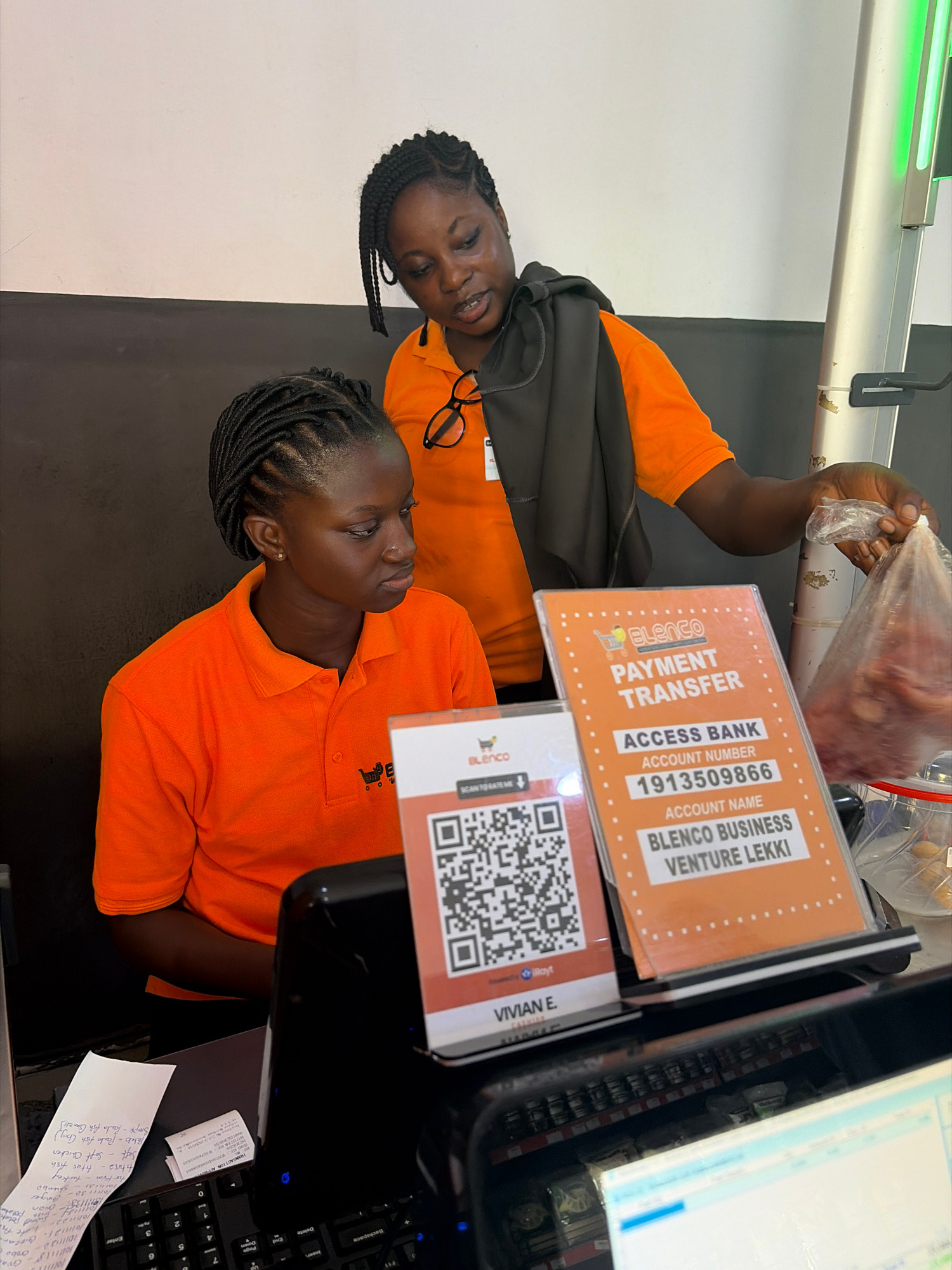 Here's a detailed description of the image: **Scene:** A checkout counter at what appears to be a Blenco Business Venture Lekki store in Igboefon, Nigeria. **People:** Two Black female employees, bo…read more