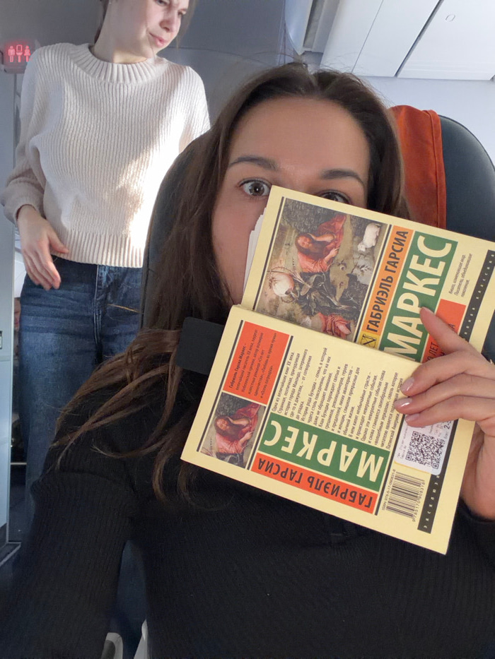 Inside an aircraft cabin, a female subject is seated in the foreground, partially obscuring her face with two identical copies of a yellow-covered book titled "ГАБРИЭЛЬ ГАРСИА МАРКЕС" (Gabriel García…read more