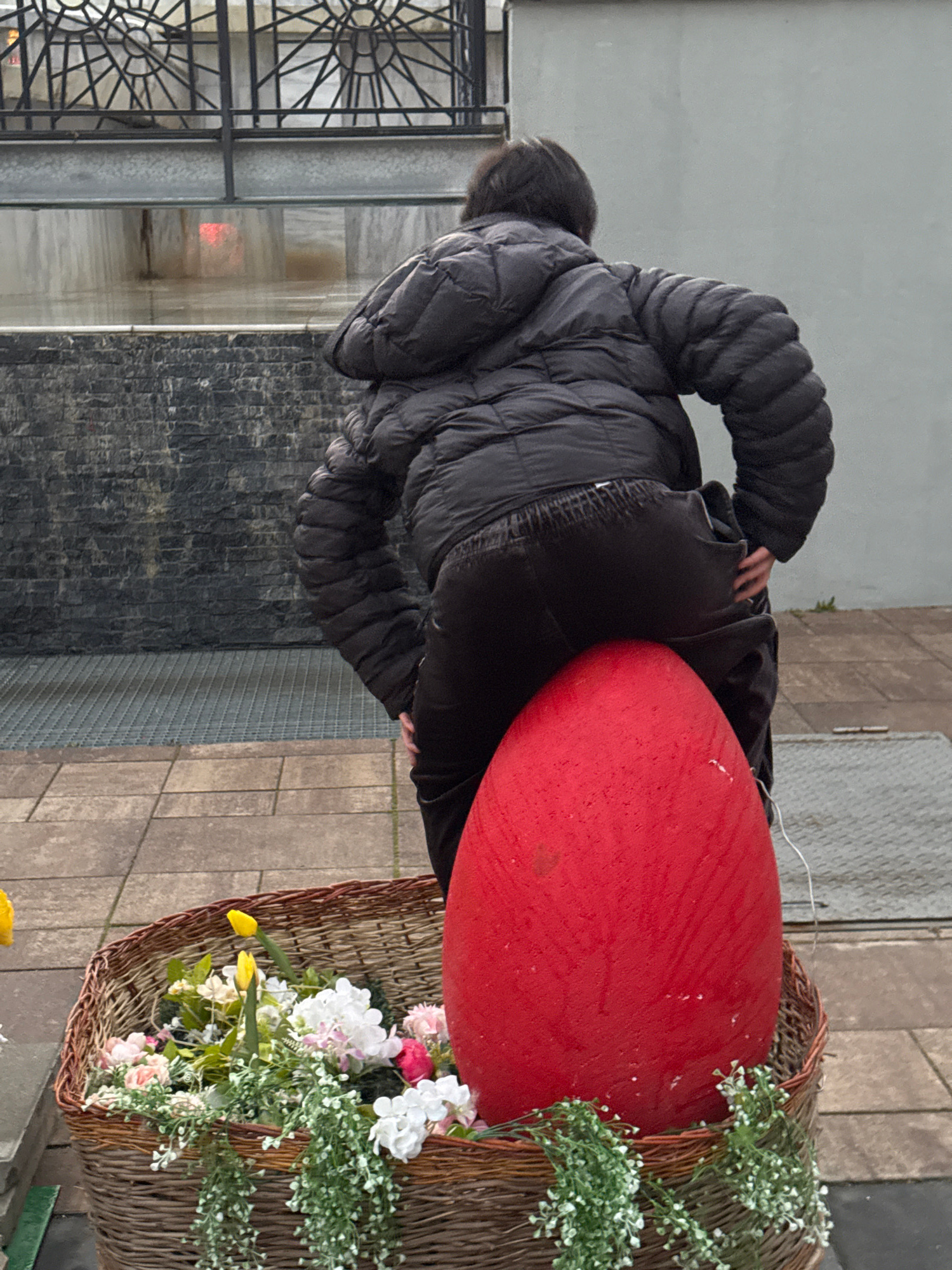 A person in a black puffy jacket is seen from behind, leaning towards a large, bright red sphere placed inside a woven basket filled with flowers, in Karlovo, Bulgaria. The location appears to be outd…read more
