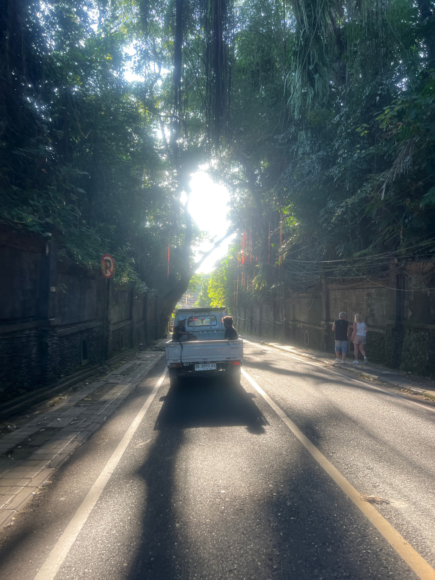 This photograph was taken on a street in Ubud, Indonesia. The street is lined with lush tropical vegetation. There are two people walking on the side of the street in the distance. A small truck is tr…read more