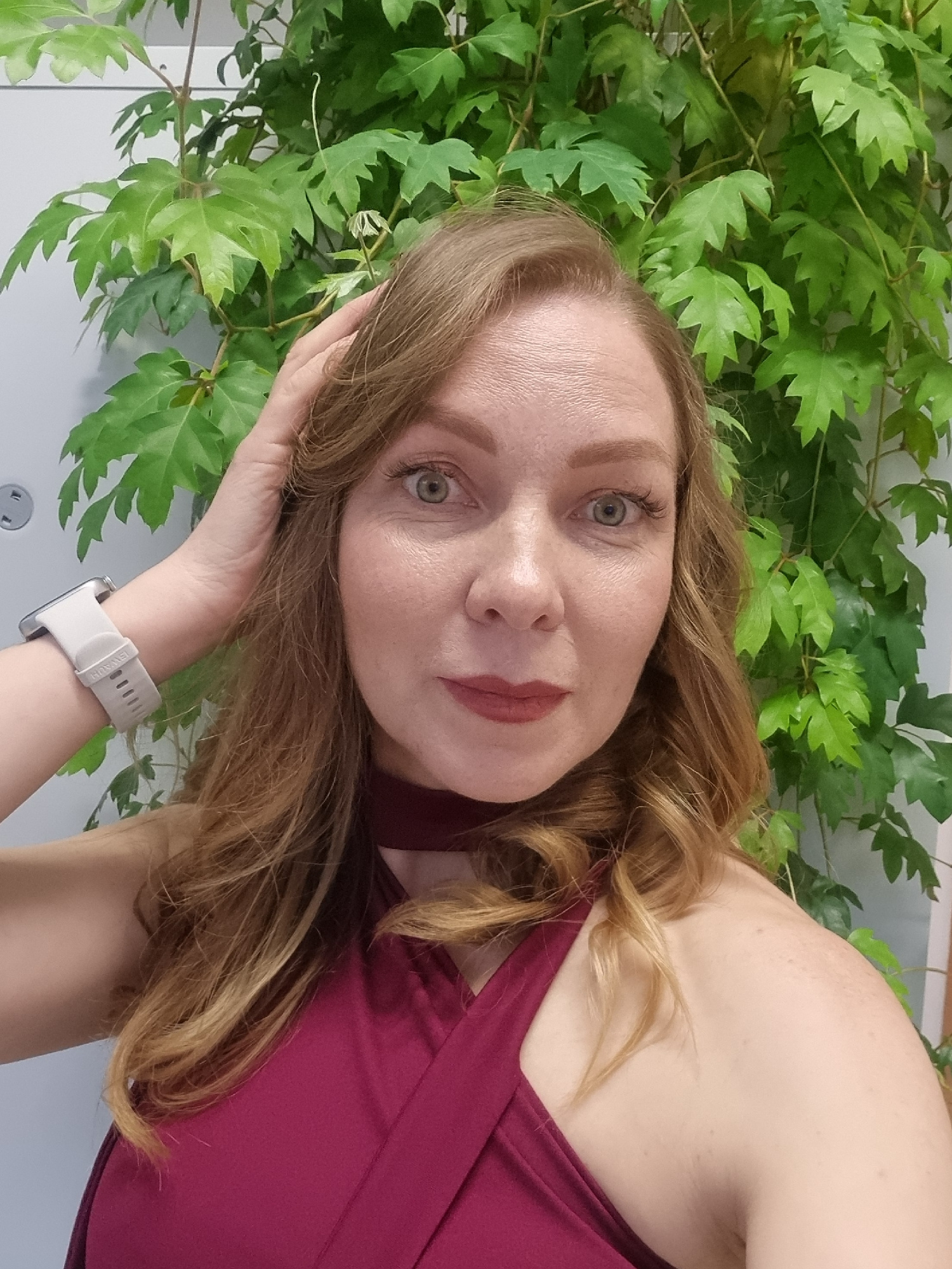 A selfie shows a woman with fair skin, light brown hair, and green eyes wearing a maroon-colored top and a white smartwatch on her left wrist. Her left hand is near her face, with her head slightly ti…read more