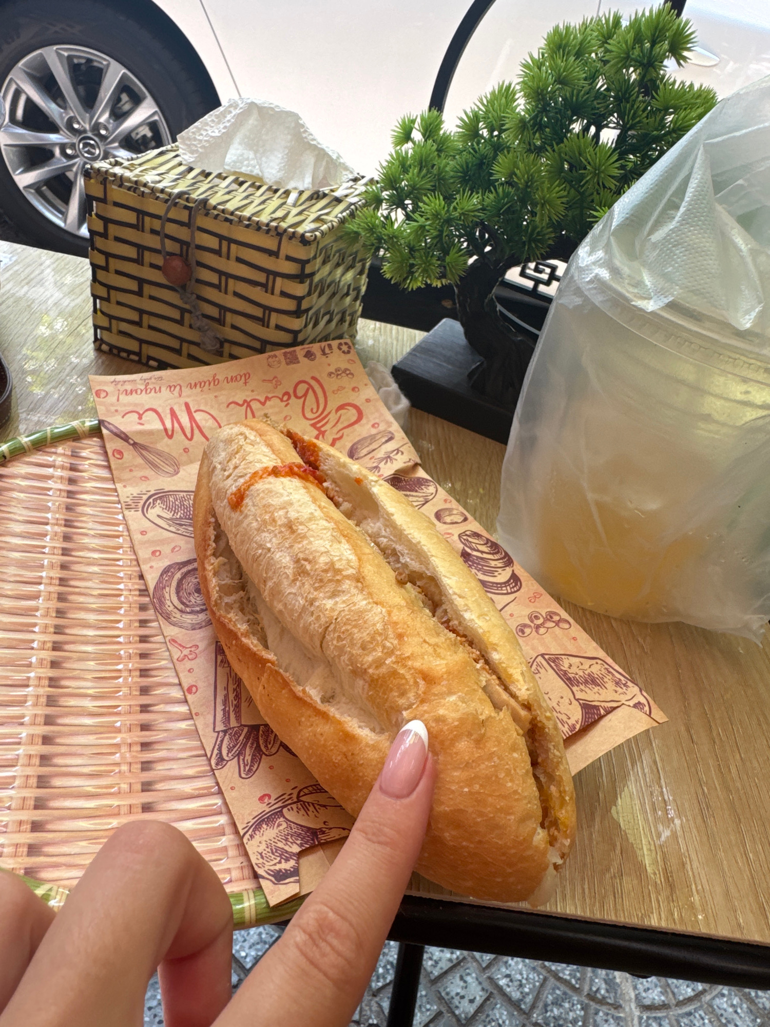A close-up, slightly high-angle shot shows a partially eaten bánh mì sandwich on a printed paper wrapper. A hand with manicured nails points toward the sandwich. The sandwich is on a woven tray. Besid…read more