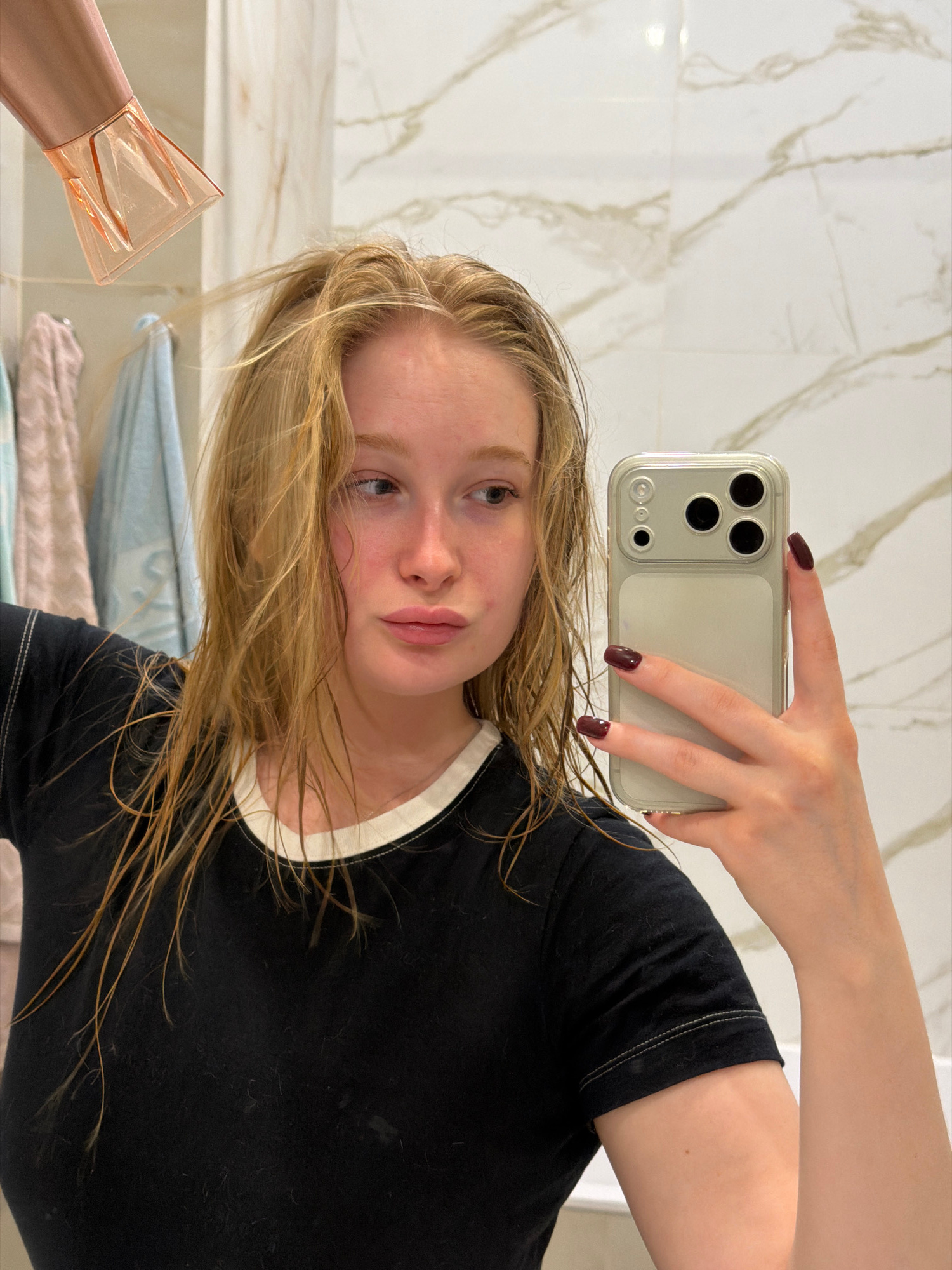 A young woman is taking a selfie in a bathroom. She is holding a silver smartphone with a triple-lens camera. She has light brown hair that appears wet, and she is wearing a black t-shirt with a white…read more