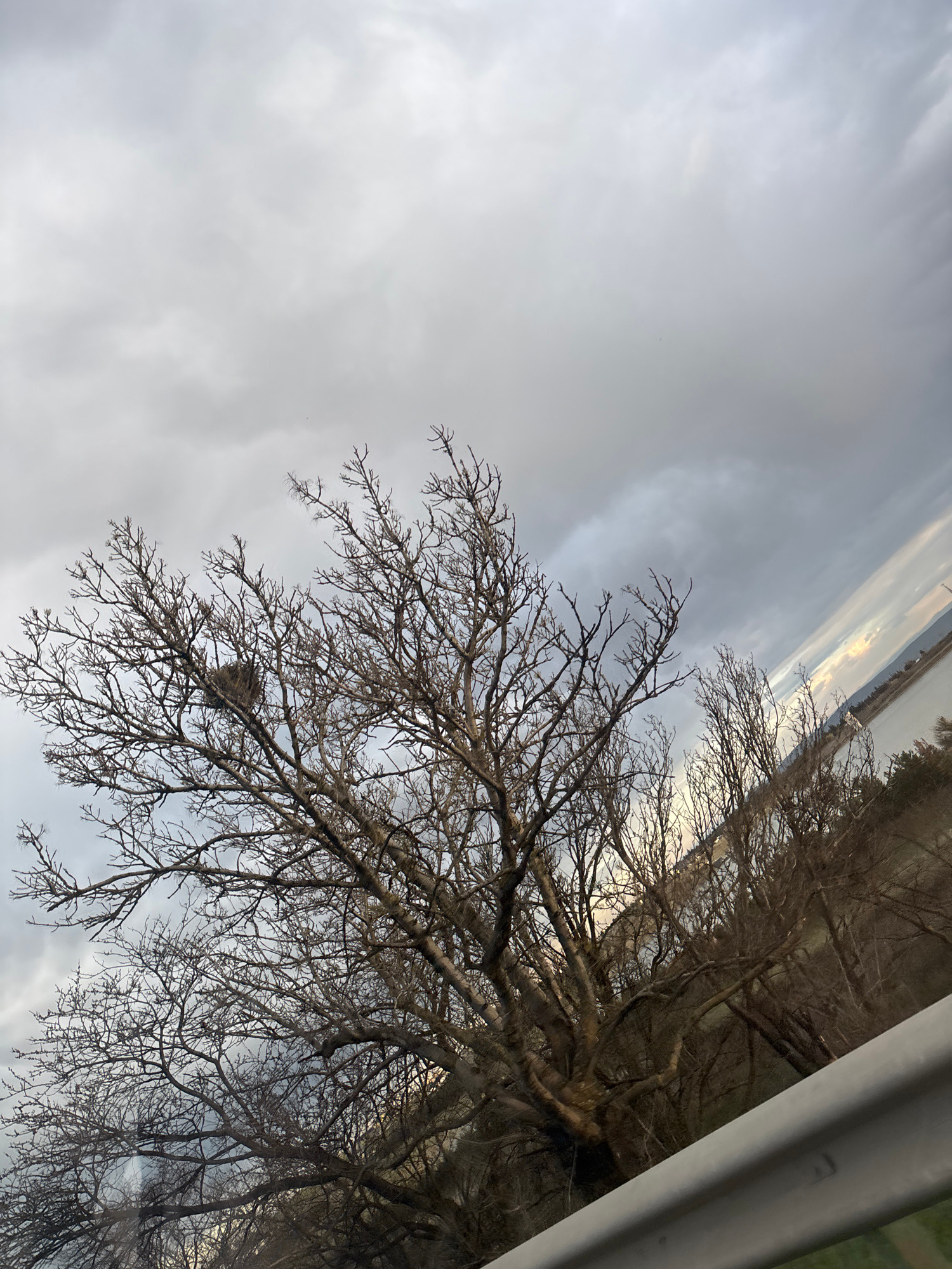 The image depicts bare tree branches against a cloudy sky. A bird's nest is visible among the branches. The photo appears to have been taken from inside a vehicle, as part of the frame includes a sect…read more