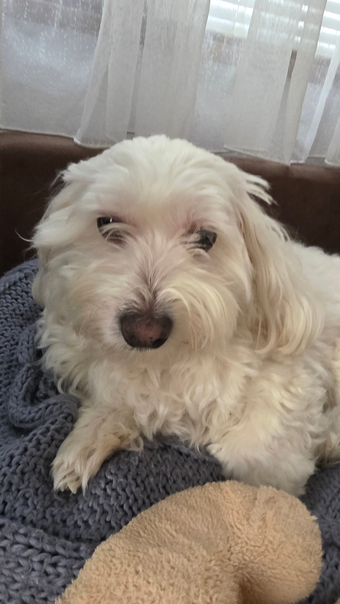 A fluffy, white Maltese dog is lying on a dark gray, knit blanket. A beige, plush object is next to the dog. The dog has dark eyes and a pink nose. A window with translucent curtains is in the backgro…read more