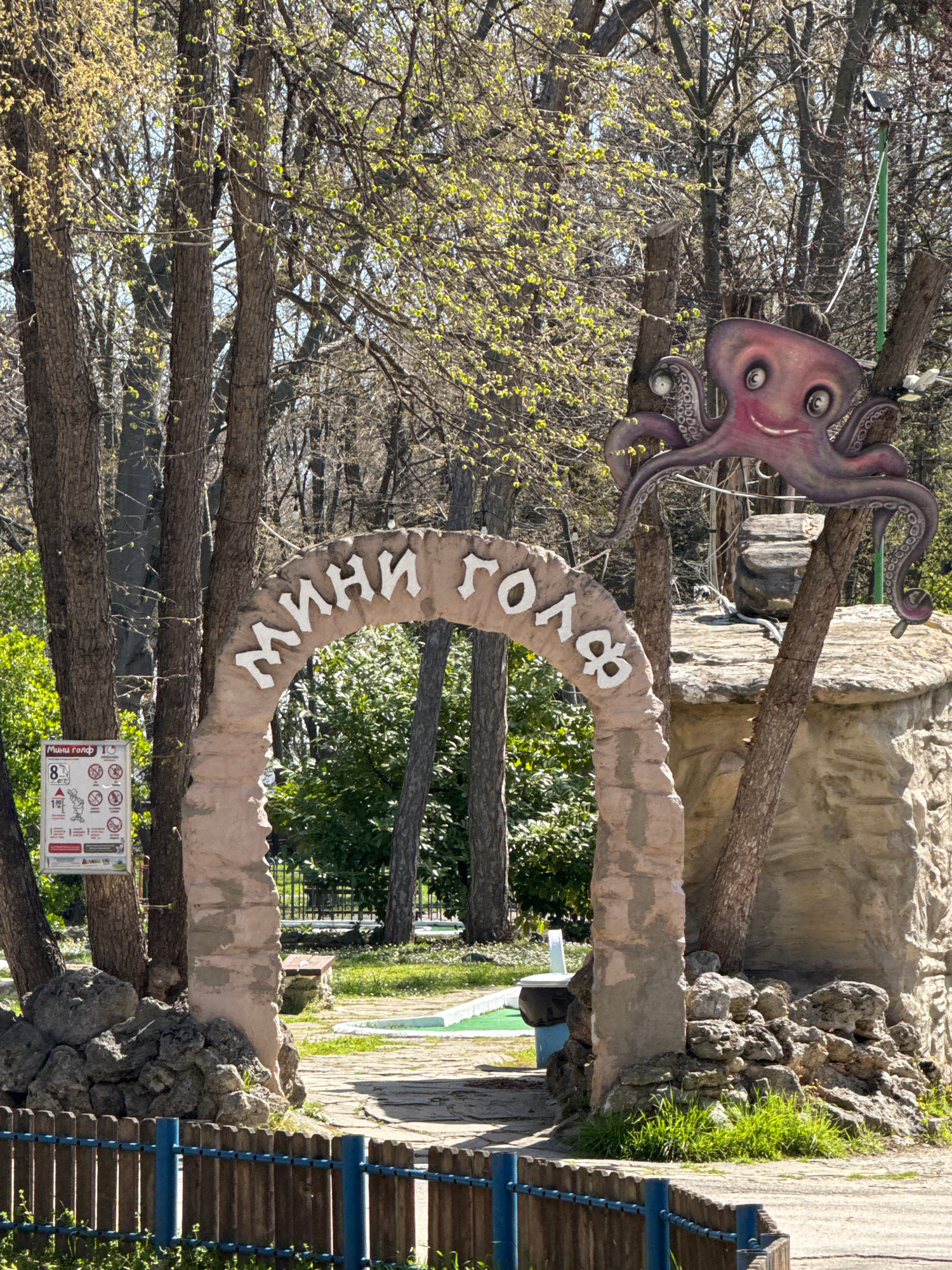 The image displays an outdoor scene, likely the entrance to a miniature golf course or similar recreational area, illuminated by bright daylight. A prominent, arch-shaped structure, appearing to be ma…read more