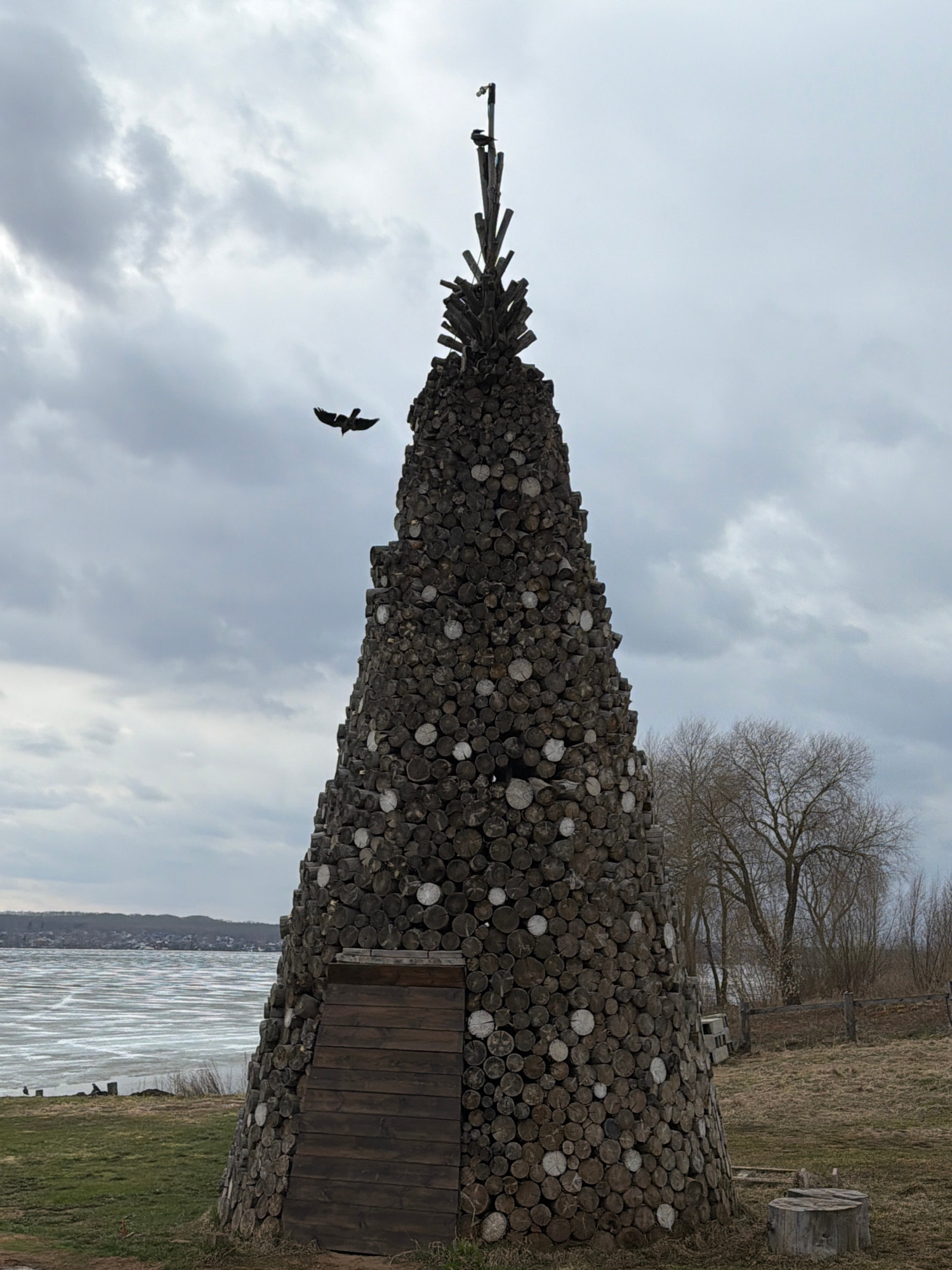 The image depicts a tall, cone-shaped structure constructed from stacked logs, resembling a teepee or wigwam, located near a body of water. The structure appears to have a wooden door. A bird is flyin…read more