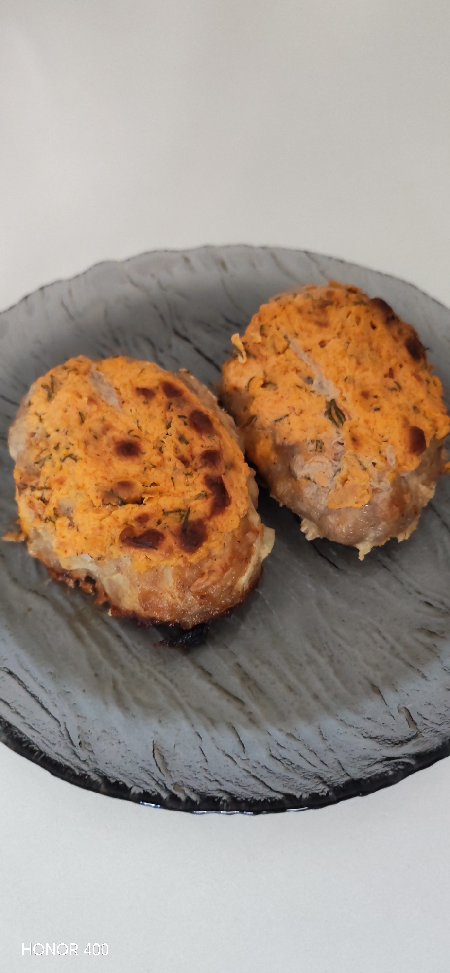 Two cooked, round meat patties with an orange topping are presented on a gray, textured glass plate. The environment appears to be indoors, with a white background. The location information provided i…read more