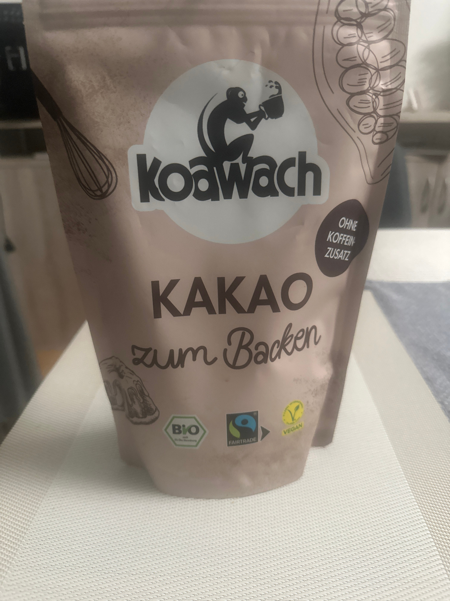 The image shows a package of "Koawach Kakao zum Backen" (Koawach Cocoa for Baking). The packaging is primarily beige with a white circular logo containing a stylized image of a monkey holding a cup, lā¦read more