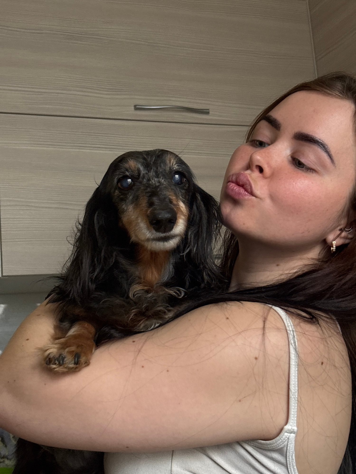 A person with long dark hair and fair skin is holding a black and brown dachshund dog. The person is wearing a white tank top and has an earring in their left ear. They are looking down with pursed li…read more