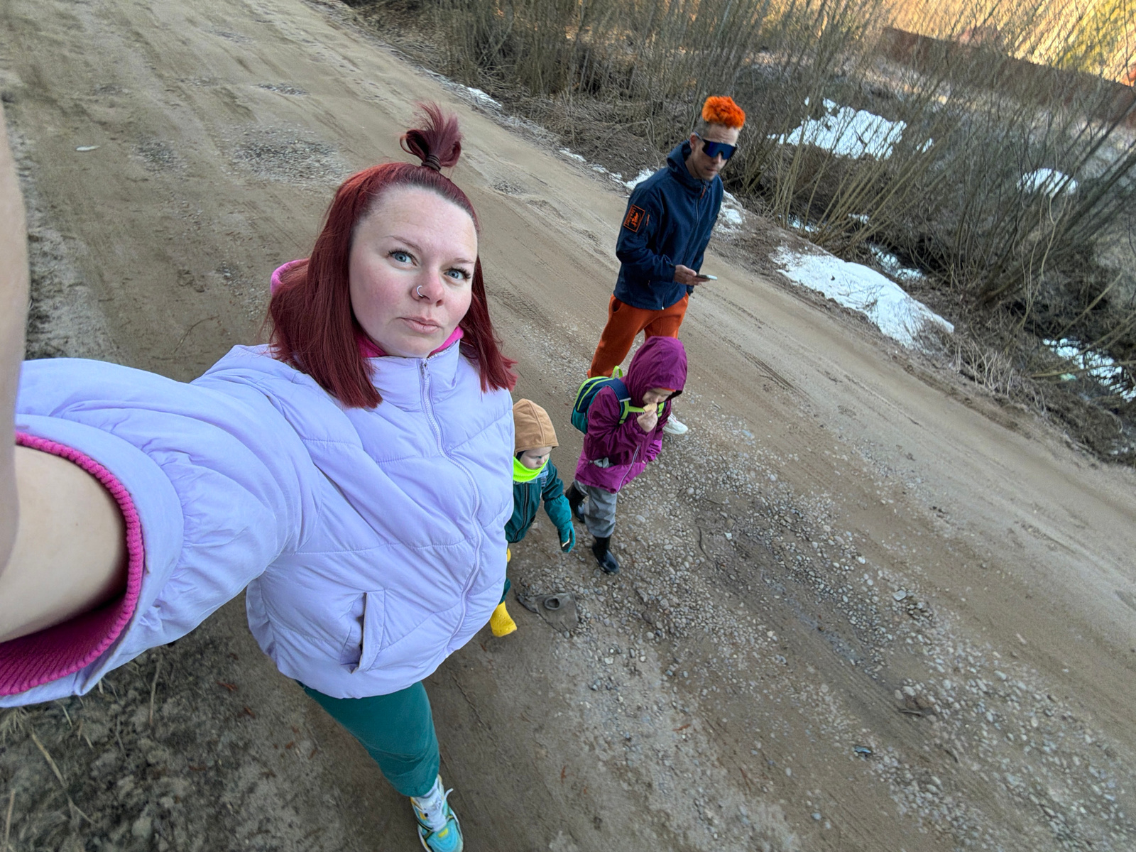 The image captures a scene on a dirt road or path on the outskirts of Chaikovsky, Russia, characterized by gravel and patches of melting snow. A person with reddish-auburn hair and a lilac-colored puf…read more