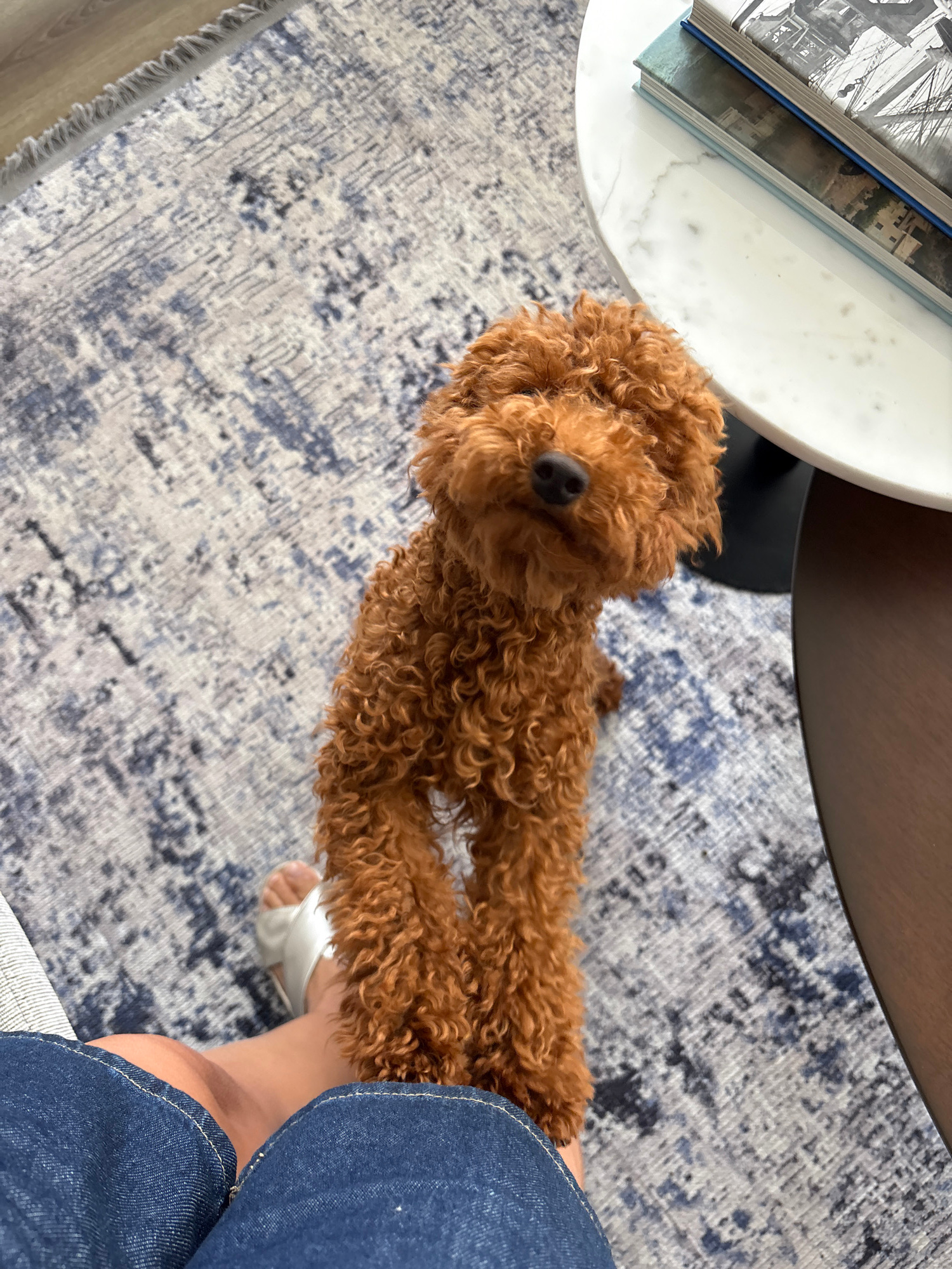 The image shows a brown poodle standing on a patterned gray and blue rug in what appears to be an interior setting. Part of a white marble-topped side table is visible to the left, with books stacked…read more
