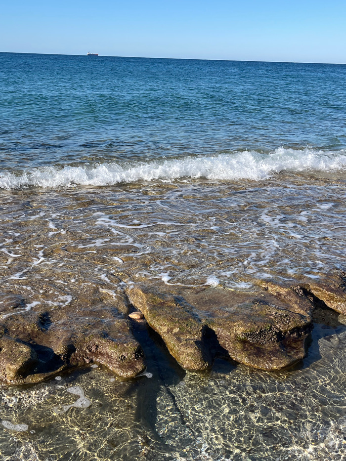 The image displays a coastal scene in Alanya, Turkey, under a clear blue sky. The foreground features shallow, transparent seawater revealing dark, irregularly shaped rock formations partially covered…read more