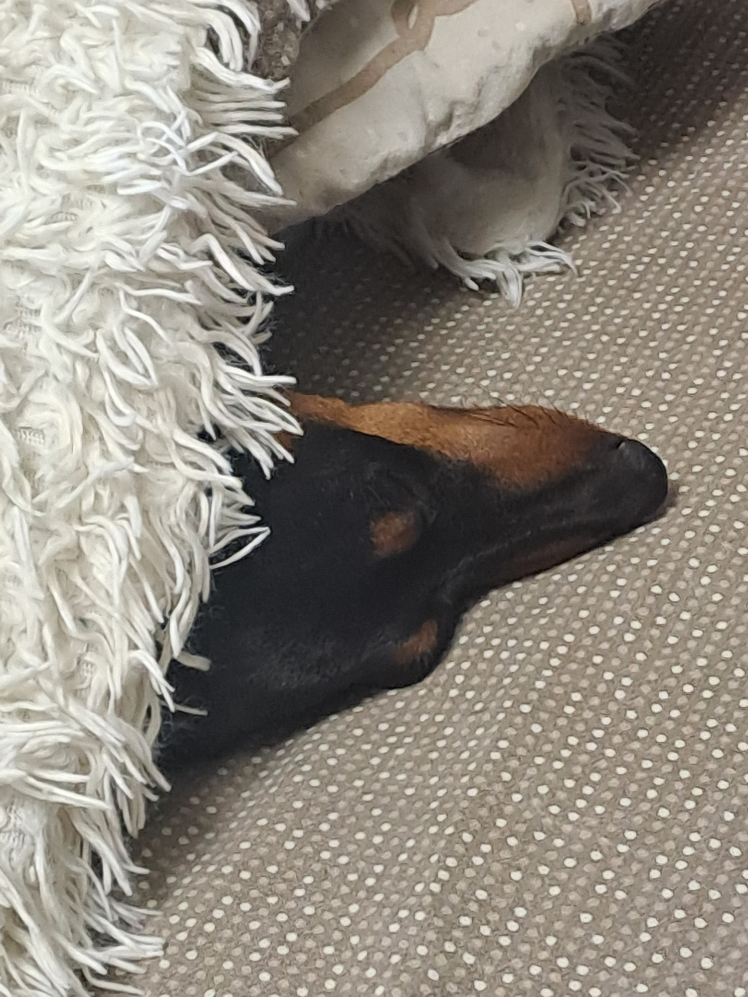 The image displays a close-up view of a dog's head, likely a black and tan dachshund or a similar short-haired breed, resting comfortably in an indoor setting. The dog's head is visible from the side,…read more