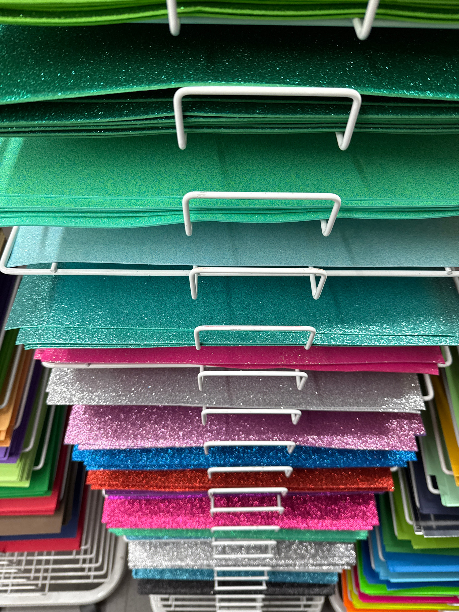 The image depicts rows of glittery craft paper in various colors, including green, teal, pink, silver, purple, blue, and copper. The paper is stacked and held in place by a white wire rack. Other colo…read more