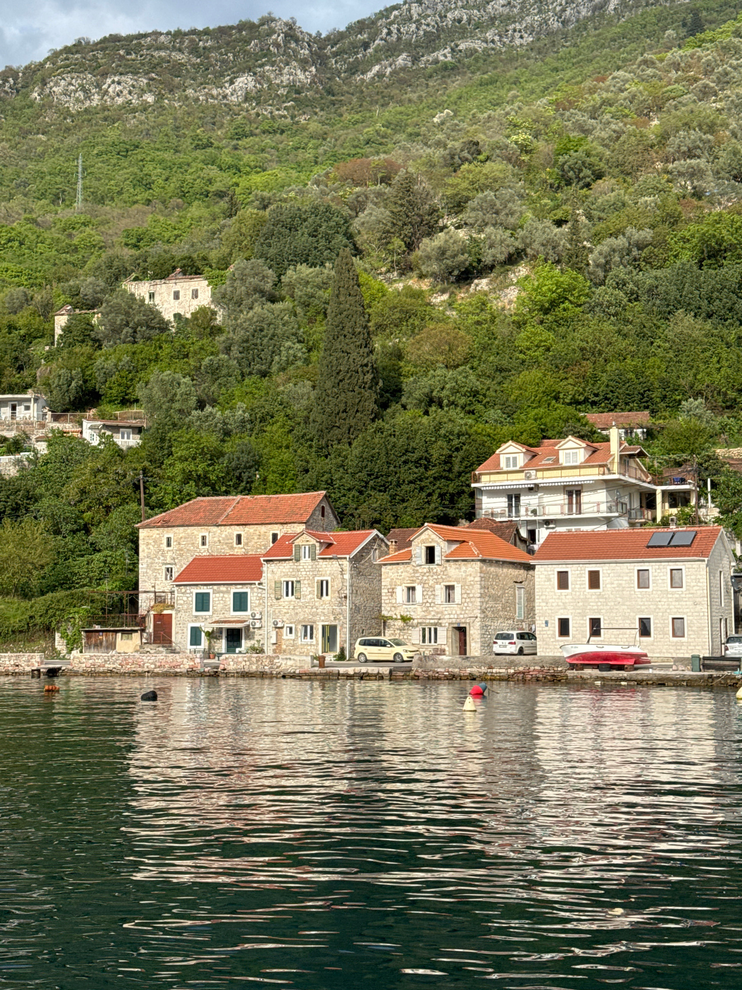 The image displays a picturesque coastal settlement in Lepetane, Montenegro, with buildings lining a waterfront against a backdrop of a steep, densely forested hillside. Numerous stone-built houses wi…read more