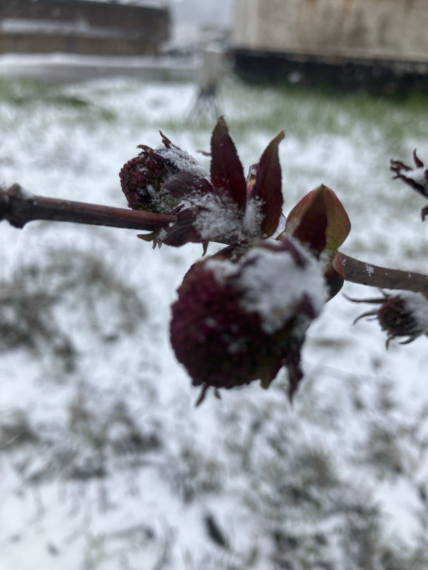 The image shows a close-up of a plant branch covered in snow. The branch has several buds, also covered in snow. The background is blurred and appears to be a snowy outdoor scene, possibly in the city…read more