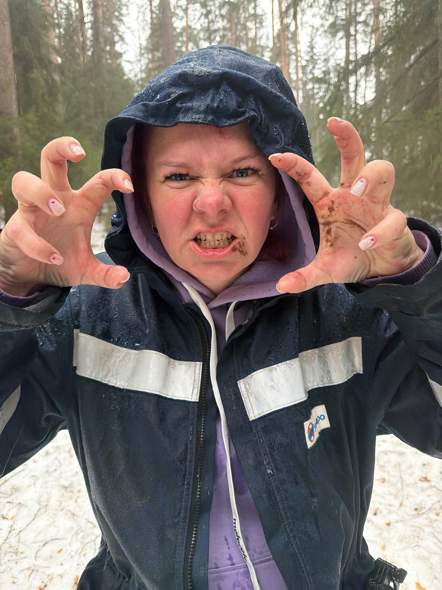 A woman in a navy blue hooded jacket with reflective stripes and a lavender hoodie underneath is posing outdoors in a snowy environment. Her hands are raised with fingers curled like claws, and there'…read more