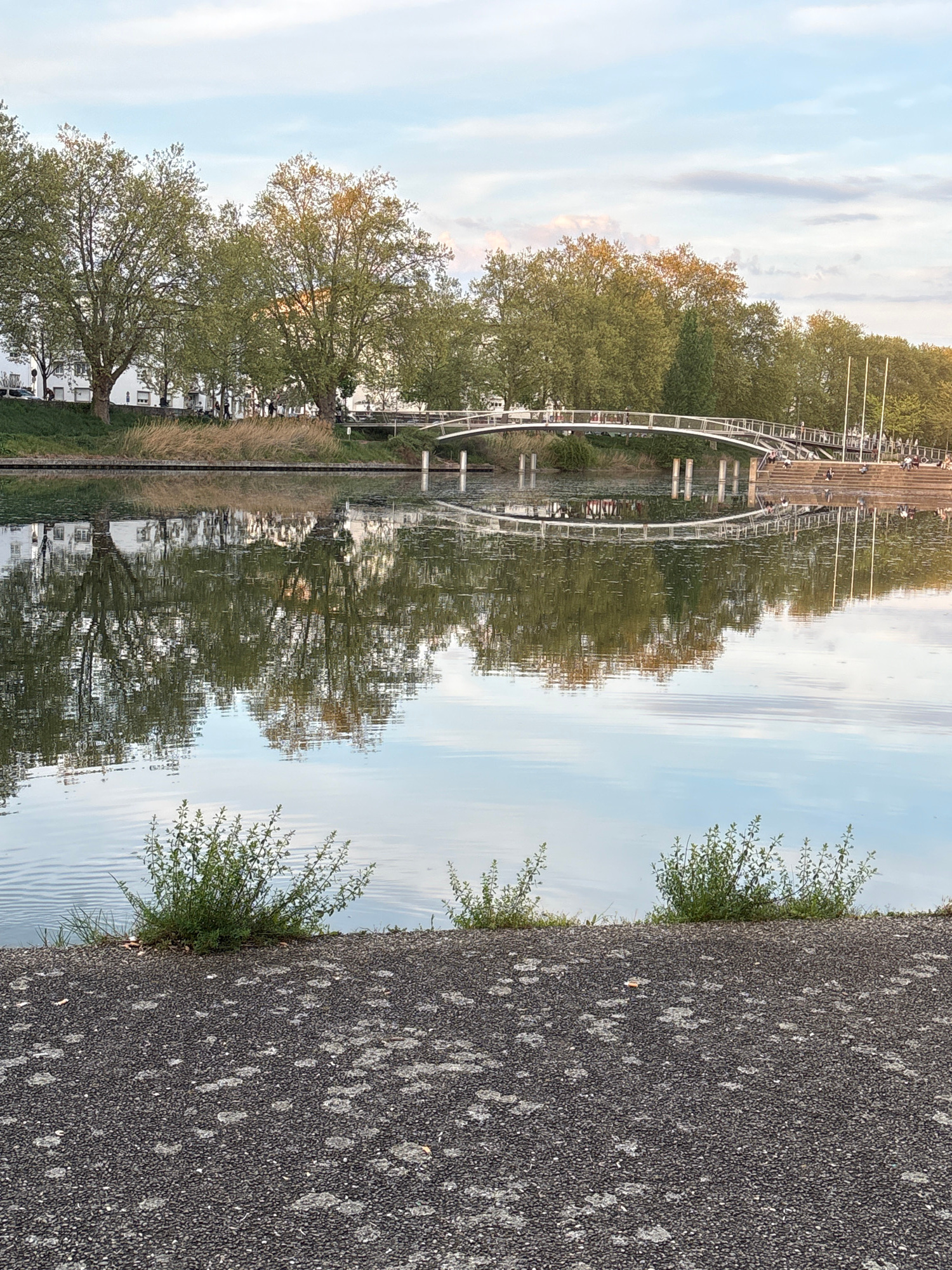 The image shows a canal with a mirrored reflection of the environment above the canal. There is a pedestrian bridge over the canal, with several people on it. Trees are visible on either side of the c…read more