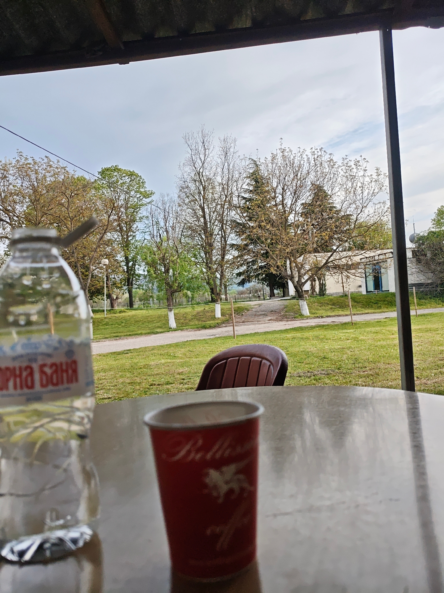 The image depicts a scene outdoors, likely a patio or veranda setting, as suggested by the overhead shelter and support beam visible in the frame. In the foreground, a water bottle labeled with the Cy…read more