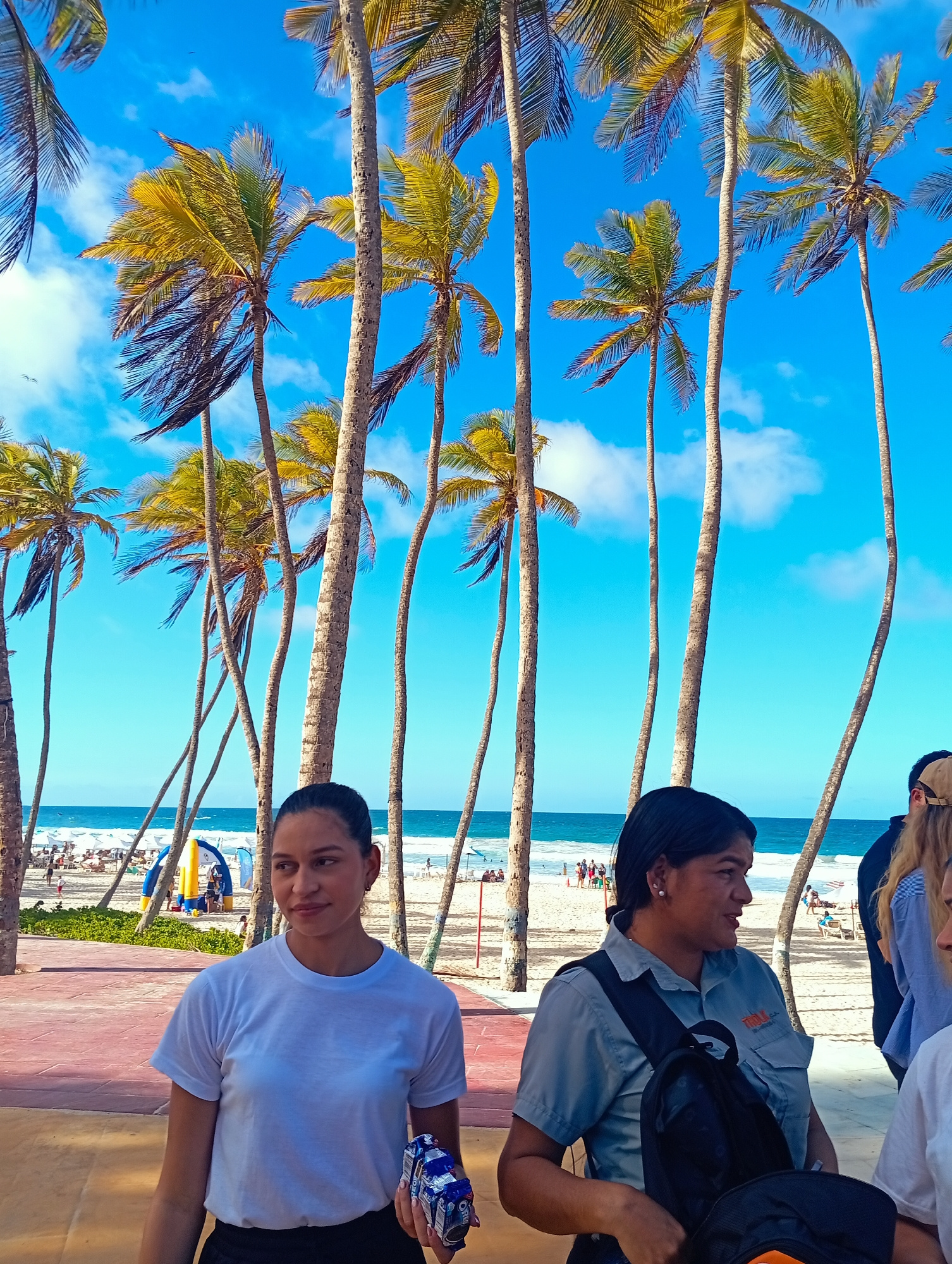 The image depicts a scene at Playa El Agua, Venezuela, with tall palm trees dominating the backdrop. In the foreground, two women are visible: one in a white t-shirt holding a package, and another in…read more