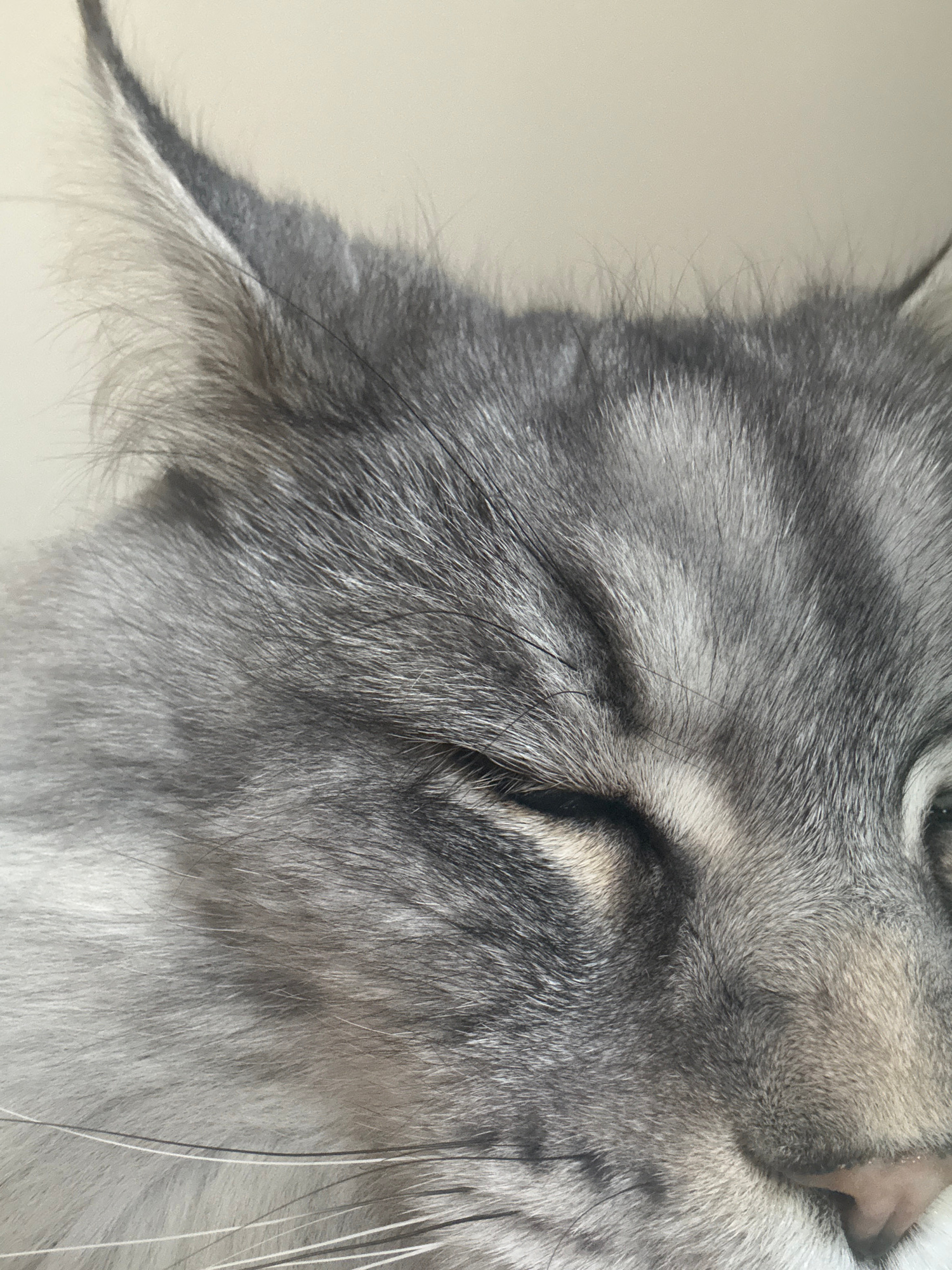 A close-up photograph shows the right side of a cat's face. The cat's fur is predominantly silver and gray with subtle variations in shading. Details visible include the texture of the fur, a partiall…read more