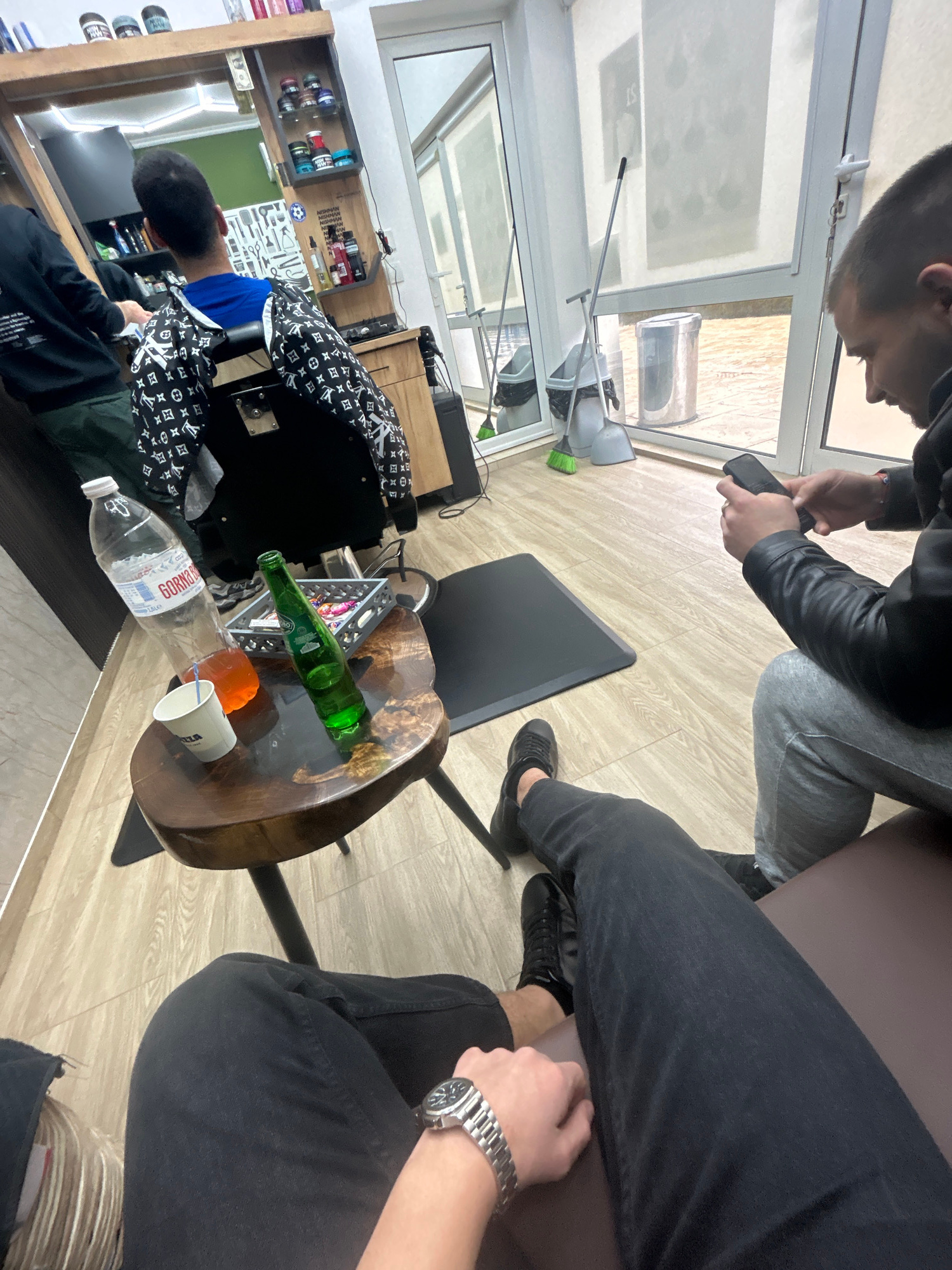 The image shows the interior of what appears to be a barbershop in Zlatograd, Bulgaria. A barber is seen giving a haircut to a client. There are two other people present, one taking a picture with a s…read more