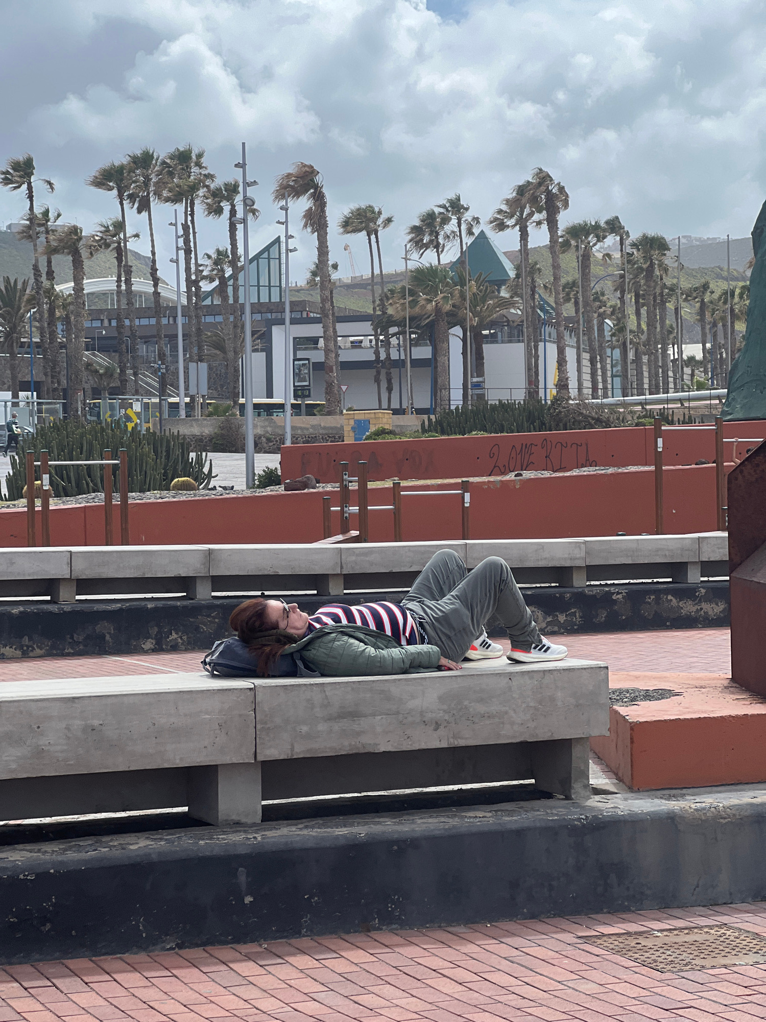 A woman is lying on a concrete ledge next to a brick walkway. The woman is wearing gray pants, white sneakers, a green jacket, and a striped shirt. In the background are palm trees, buildings, and a c…read more