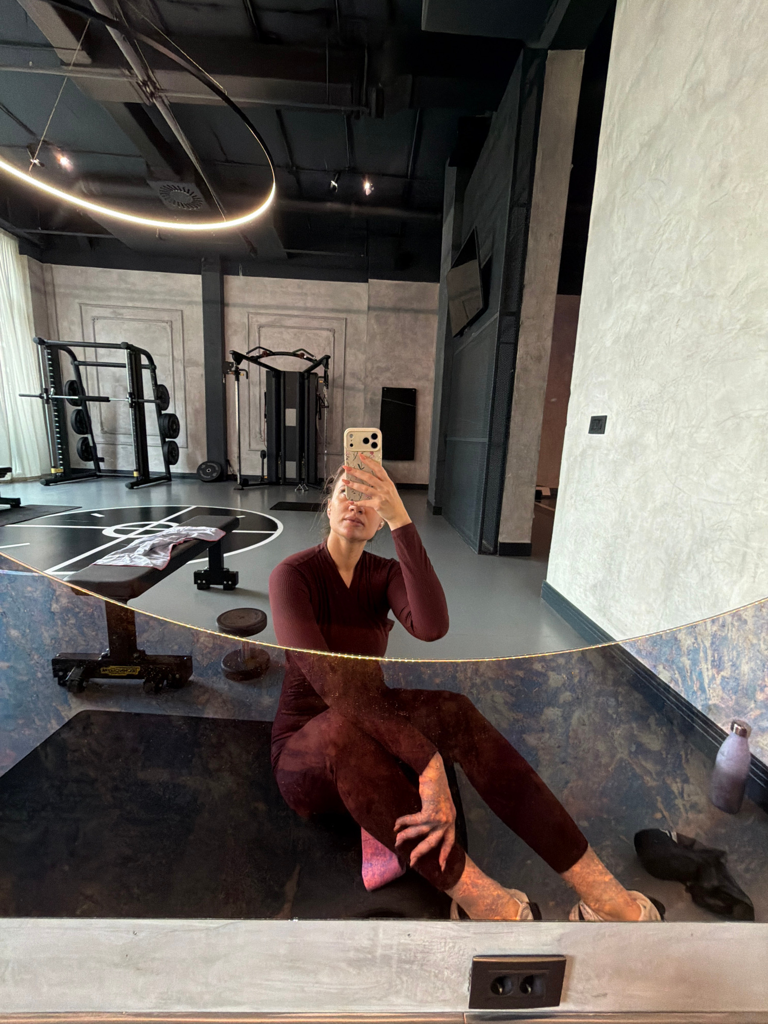 The image appears to be a selfie taken in a gym or fitness studio, possibly in Belgrade, Serbia, based on the surroundings. The main subject is a person reflected in a mirror, holding a smartphone to…read more