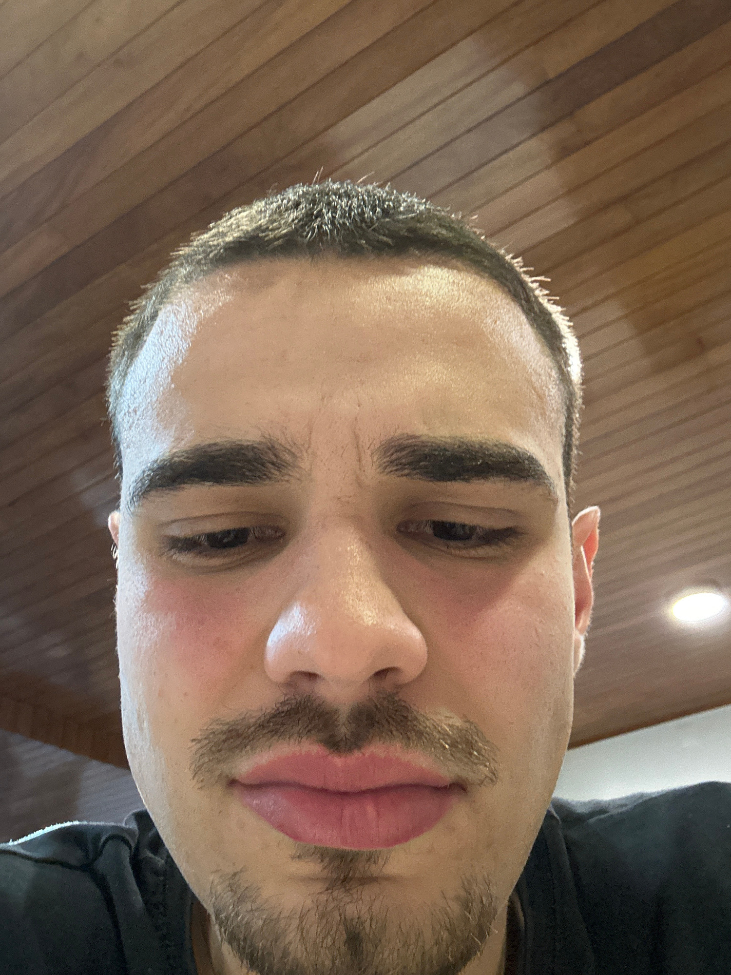 A close-up, tilted, indoor photograph depicts a man's face. He has dark hair, short and close-cropped, with dark eyebrows and stubble. The man's skin appears light and slightly flushed. The background…read more
