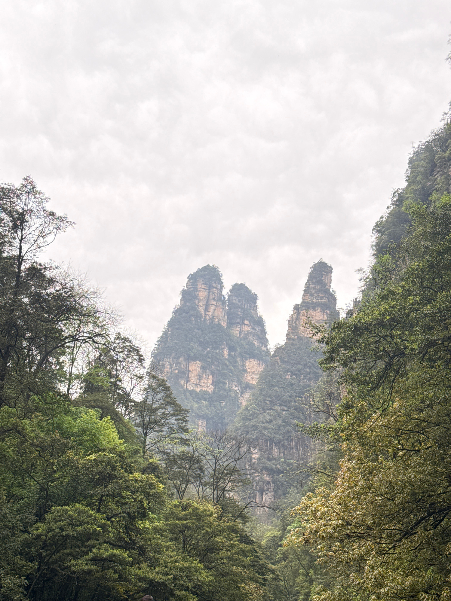 The image depicts a view in Luoguta, China, likely within a mountainous or forested area. Dominating the scene are rock formations with visible stratification, indicative of geological processes. Thes…read more