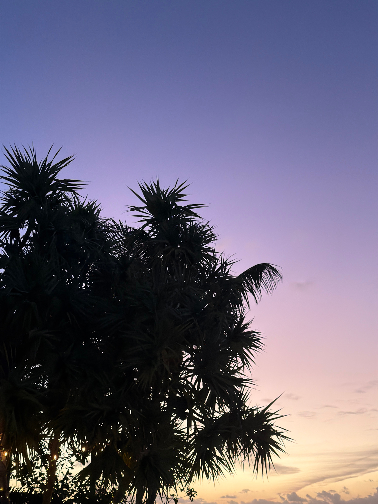 The image shows the silhouette of a tree against a colorful sky. The sky fades from deep purple on the left to light orange/yellow on the right, with faint clouds visible in the lighter portion. The t…read more